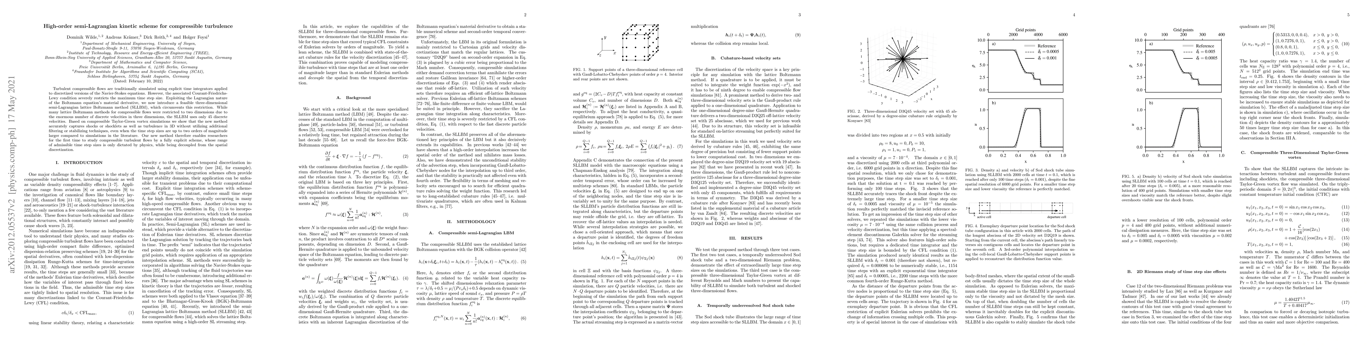 Researchers have developed a new 3D semi-Lagrangian lattice Boltzmann method that accurately simulates compressible turbulent flows without the need for additional filtering or stabilizing techniques, allowing for larger time step sizes than traditional methods.