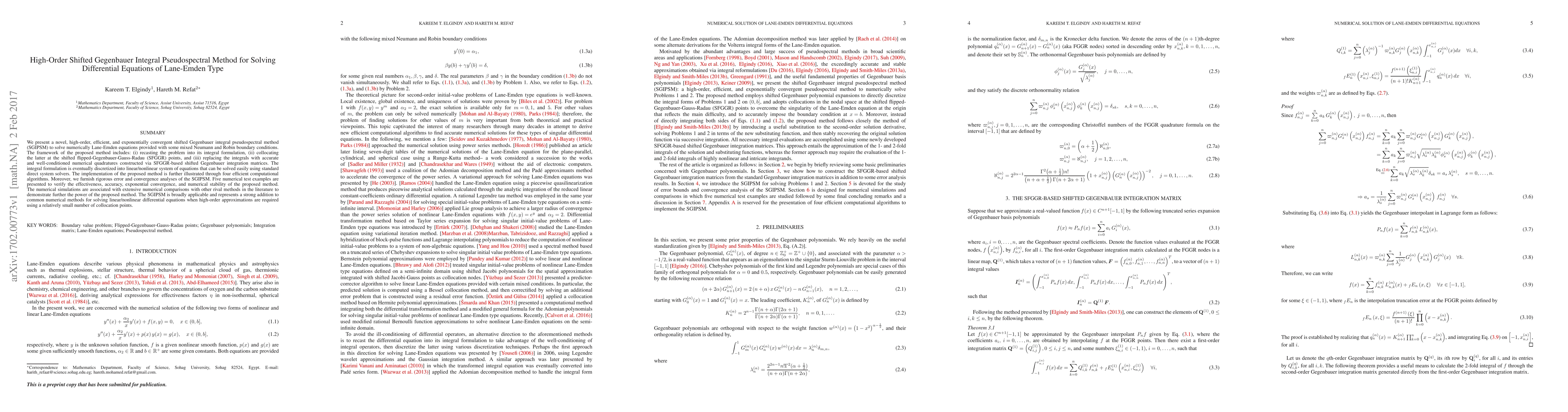 This paper introduces a high-order shifted Gegenbauer integral pseudospectral method (SGIPSM) for solving Lane-Emden differential equations with mixed boundary conditions. The method combines integral reformulation, collocation at SFGGR points, and numerical quadratures, leading to efficient and exponentially convergent solutions.