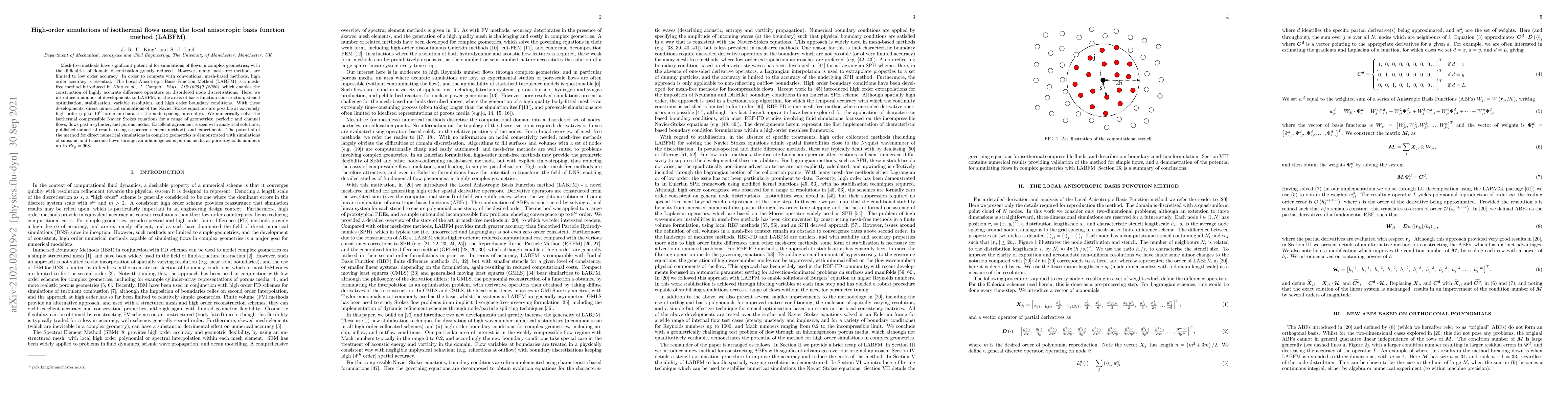This paper introduces enhancements to the Local Anisotropic Basis Function Method (LABFM), enabling high-order (up to 10th order) direct numerical simulations of Navier-Stokes equations in complex geometries. The method's effectiveness is demonstrated through various flows, including those around a cylinder and through porous media, showing excellent agreement with analytical solutions, published results, and experiments.