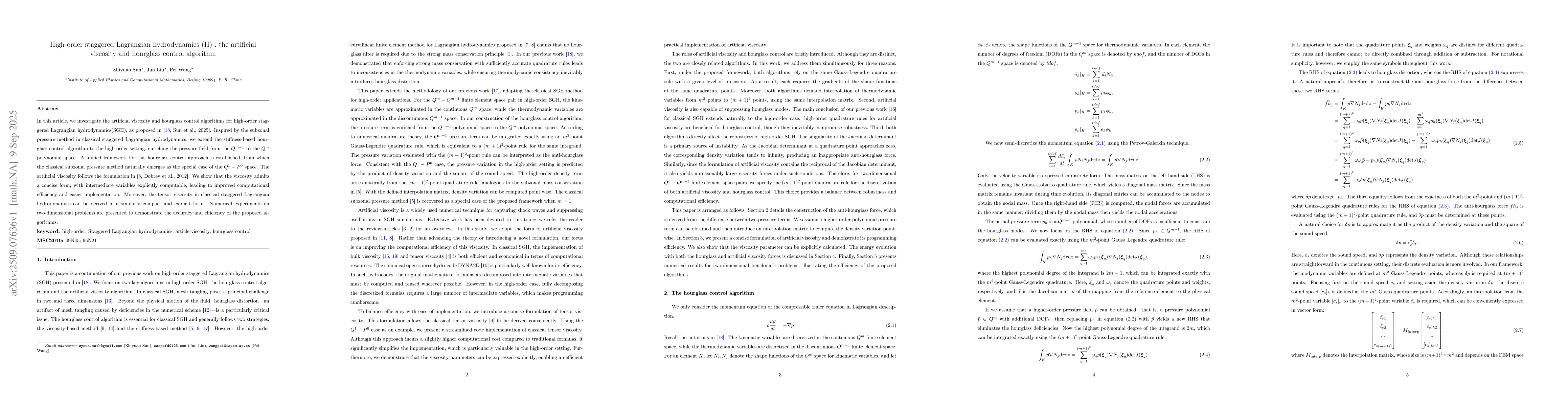 In this article, we investigate the artificial viscosity and hourglass control algorithms for high-order staggered Lagrangian hydrodynamics(SGH), as proposed in~\cite[Sun et al., 2025]{Sun2025High}. Inspired by the subzonal pressure method in classical staggered Lagrangian hydrodynamics, we extend the stiffness-based hourglass control algorithm to the high-order setting, enriching the pressure field from the $Q^{m-1}$ to the $Q^{m}$ polynomial space. A unified framework for this hourglass control approach is established, from which the classical subzonal pressure method naturally emerges as the special case of the $Q^1-P^0$ space. The artificial viscosity follows the formulation in~\cite[Dobrev et al., 2012]{Dobrev2012High}. We show that the viscosity admits a concise form, with intermediate variables explicitly computable, leading to improved computational efficiency and easier implementation. Moreover, the tensor viscosity in classical staggered Lagrangian hydrodynamics can be derived in a similarly compact and explicit form. Numerical experiments on two-dimensional problems are presented to demonstrate the accuracy and efficiency of the proposed algorithms.