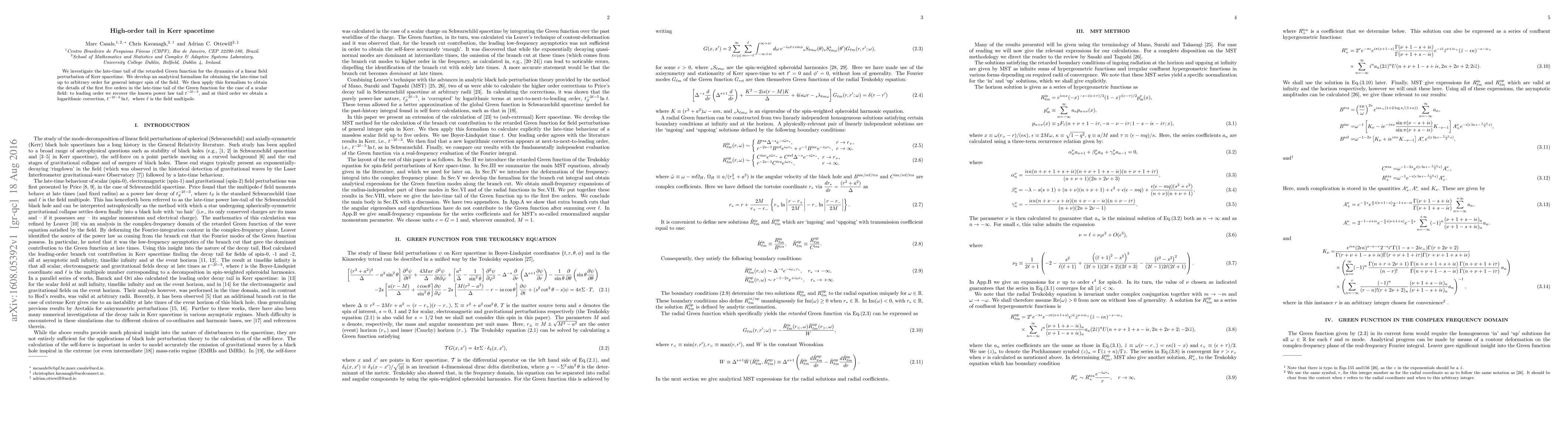 Researchers developed an analytical formalism to study the late-time tail of a scalar field's dynamics in Kerr spacetime, finding power law tails up to third order, including a logarithmic correction.