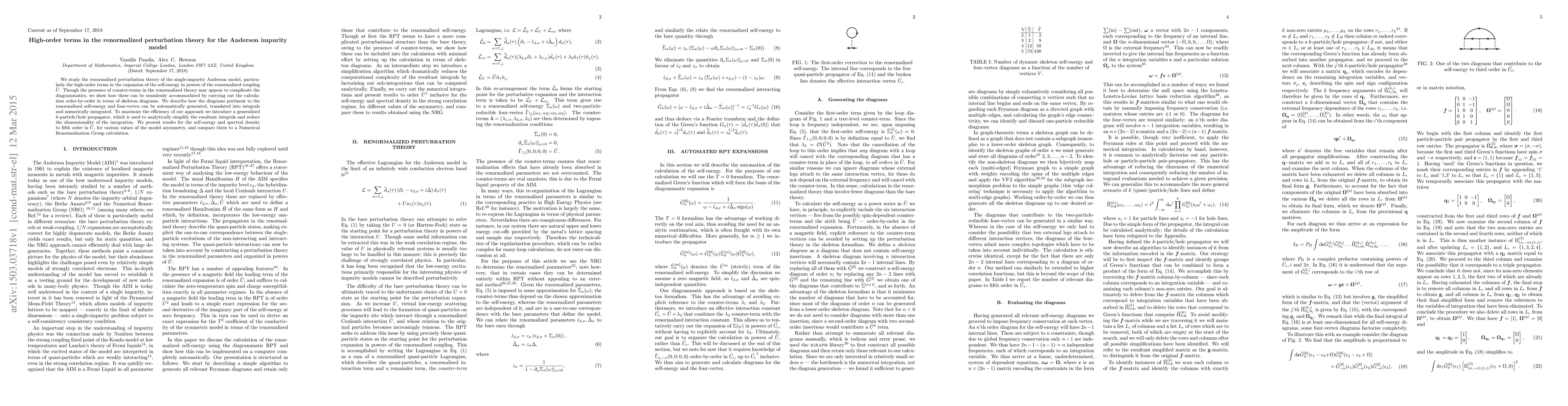 We study the renormalized perturbation theory of the single-impurity Anderson model, particularly the high-order terms in the expansion of the self-energy in powers of the renormalized coupling $\tilde{U}$. Though the presence of counter-terms in the renormalized theory may appear to complicate the diagrammatics, we show how these can be seamlessly accommodated by carrying out the calculation order-by-order in terms of skeleton diagrams. We describe how the diagrams pertinent to the renormalized self-energy and four-vertex can be automatically generated, translated into integrals and numerically integrated. To maximize the efficiency of our approach we introduce a generalized $k$-particle/hole propagator, which is used to analytically simplify the resultant integrals and reduce the dimensionality of the integration. We present results for the self-energy and spectral density to fifth order in $\tilde{U}$, for various values of the model asymmetry, and compare them to a Numerical Renormalization Group calculation.