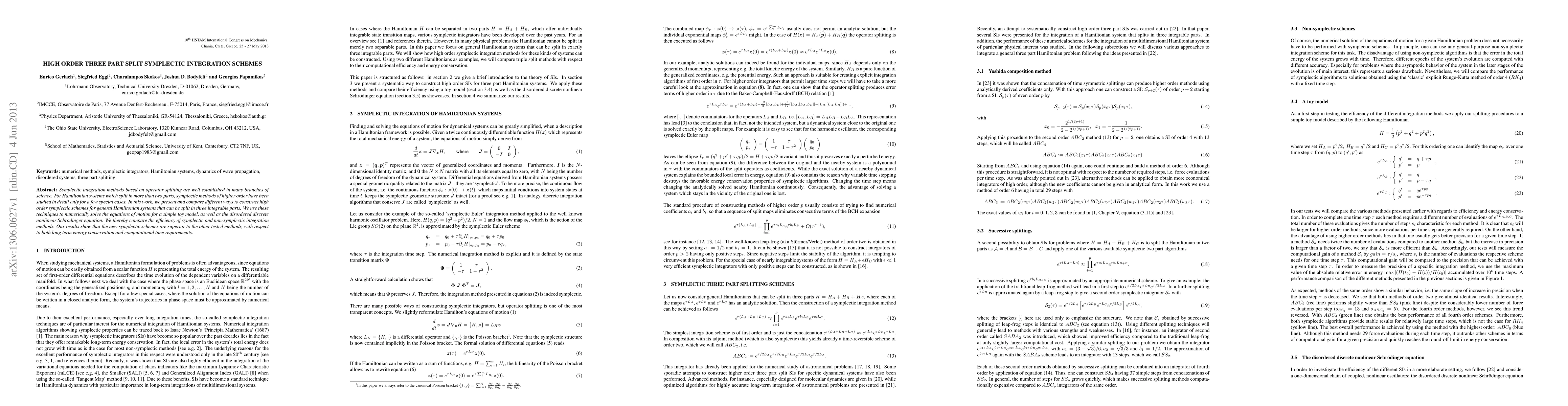 This paper develops high-order three-part split symplectic integration schemes for Hamiltonian systems that can be decomposed into three integrable parts. The new methods are shown to outperform non-symplectic approaches in terms of long-term energy conservation and computational efficiency through numerical simulations of a toy model and the disordered discrete nonlinear Schrödinger equation.