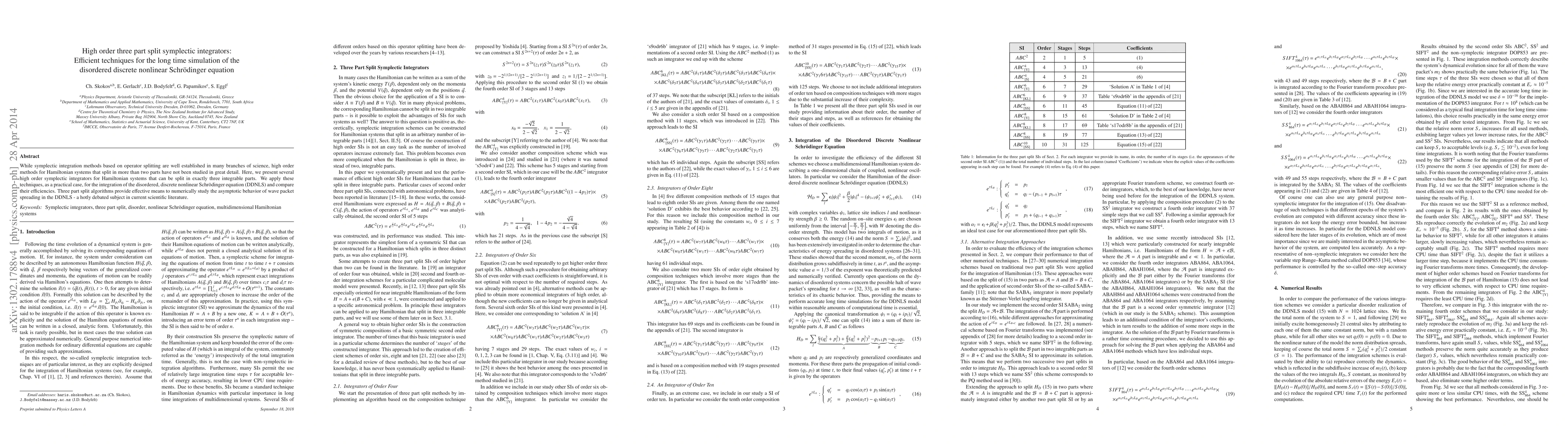 This paper introduces high order three part split symplectic integrators for Hamiltonian systems that can be divided into three integrable parts, applying these methods to simulate the disordered discrete nonlinear Schrödinger equation (DDNLS). The study compares the efficiency of these new techniques for long-term simulations, highlighting their effectiveness in analyzing wave packet spreading.