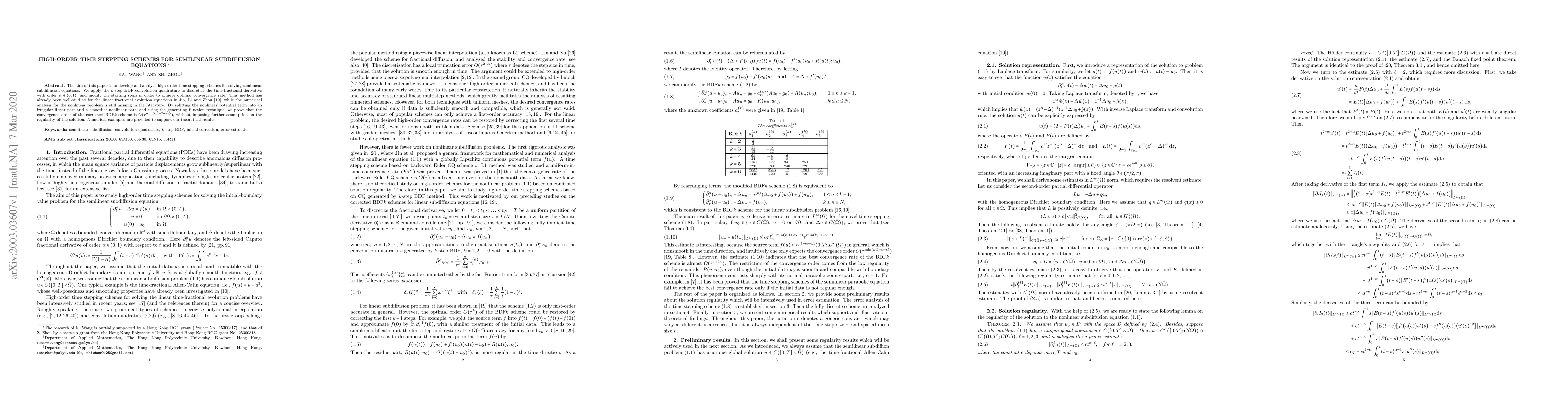 This paper develops high-order time stepping schemes for semilinear subdiffusion equations using $k$-step BDF convolution quadrature. It proves the convergence order of the corrected BDF$k$ scheme to be $O(\tau^{\min(k,1+2\alpha-\epsilon)})$, providing numerical support for the theoretical results.