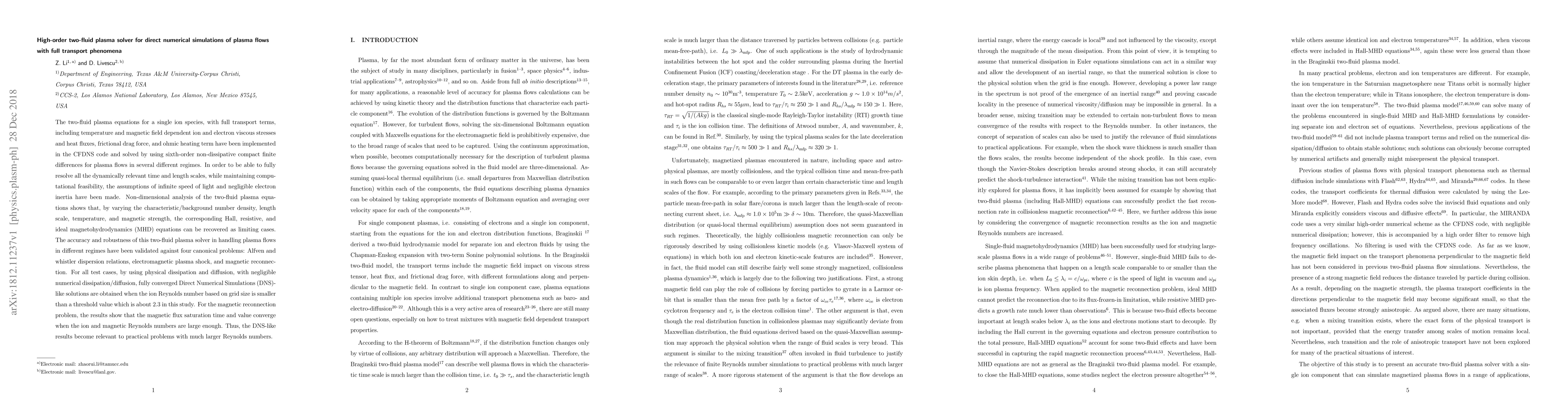 Researchers developed a high-order two-fluid plasma solver for simulating complex plasma flows, recovering ideal magnetohydrodynamics as limiting cases and achieving DNS-like solutions at lower ion Reynolds numbers.