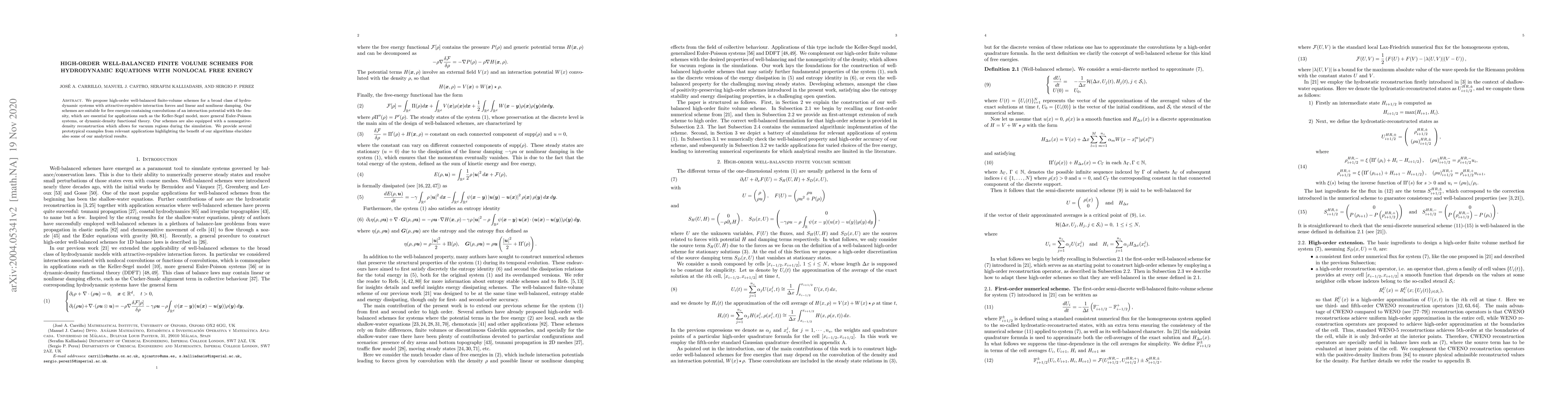 We propose high-order well-balanced finite-volume schemes for a broad class of hydrodynamic systems with attractive-repulsive interaction forces and linear and nonlinear damping. Our schemes are suitable for free energies containing convolutions of an interaction potential with the density, which are essential for applications such as the Keller-Segel model, more general Euler-Poisson systems, or dynamic-density functional theory. Our schemes are also equipped with a nonnegative-density reconstruction which allows for vacuum regions during the simulation. We provide several prototypical examples from relevant applications highlighting the benefit of our algorithms elucidate also some of our analytical results.