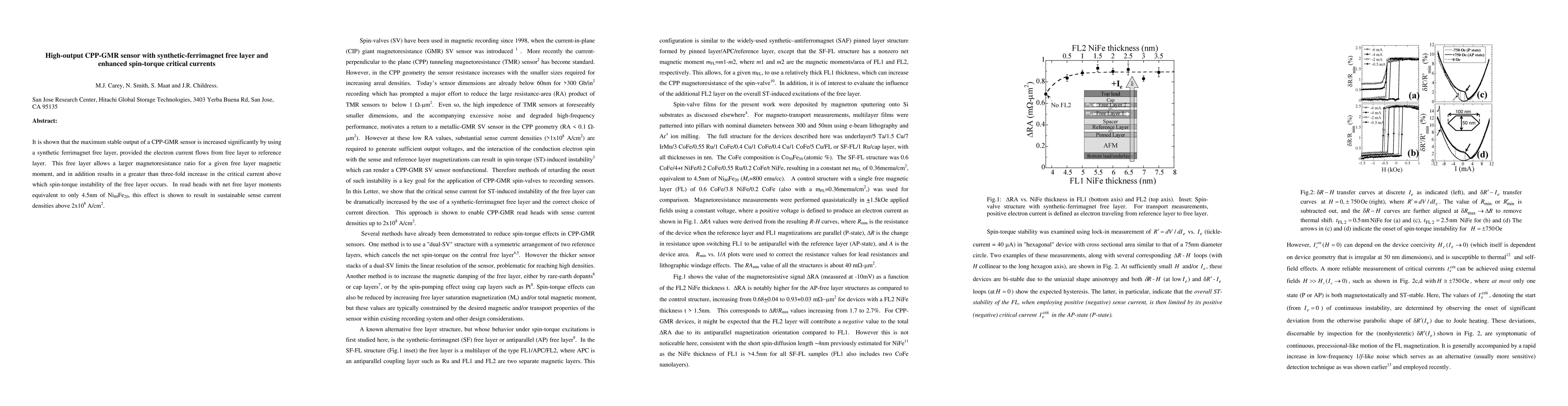 This paper demonstrates that a CPP-GMR sensor with a synthetic-ferrimagnet free layer significantly enhances output and stability, achieving a three-fold increase in critical current and enabling sense current densities over 2e8 A/cm², even with small free layer moments.