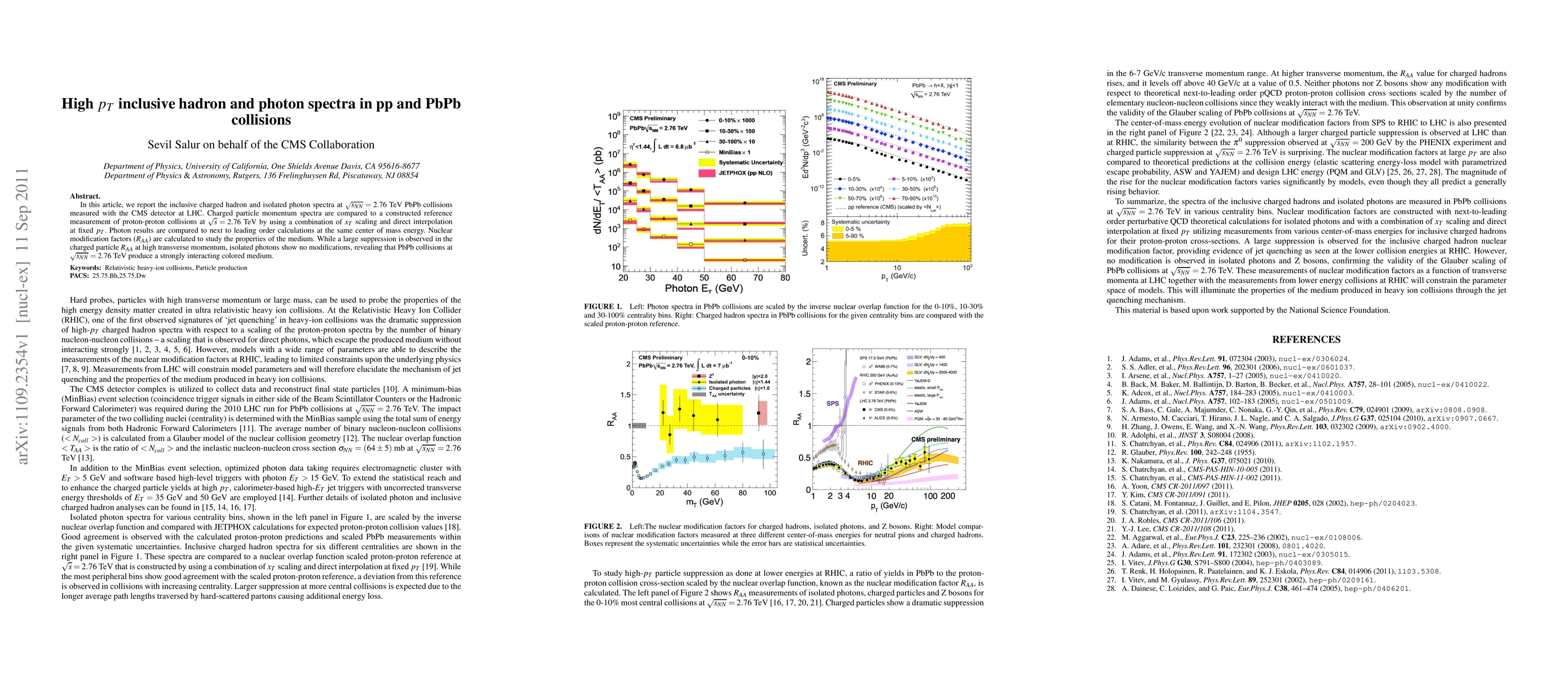 In this article, we report the inclusive charged hadron and isolated photon spectra at $\sqrt{s_{NN}}=2.76$ TeV PbPb collisions measured with the CMS detector at LHC. Charged particle momentum spectra are compared to a constructed reference measurement of proton-proton collisions at $\sqrt{s}=2.76$ TeV by using a combination of $x_T$ scaling and direct interpolation at fixed $p_{T}$. Photon results are compared to next to leading order calculations at the same center of mass energy. Nuclear modification factors ($R_{AA}$) are calculated to study the properties of the medium. While a large suppression is observed in the charged particle $R_{AA}$ at high transverse momentum, isolated photons show no modifications, revealing that PbPb collisions at $\sqrt{s_{NN}}=2.76$ TeV produce a strongly interacting colored medium.