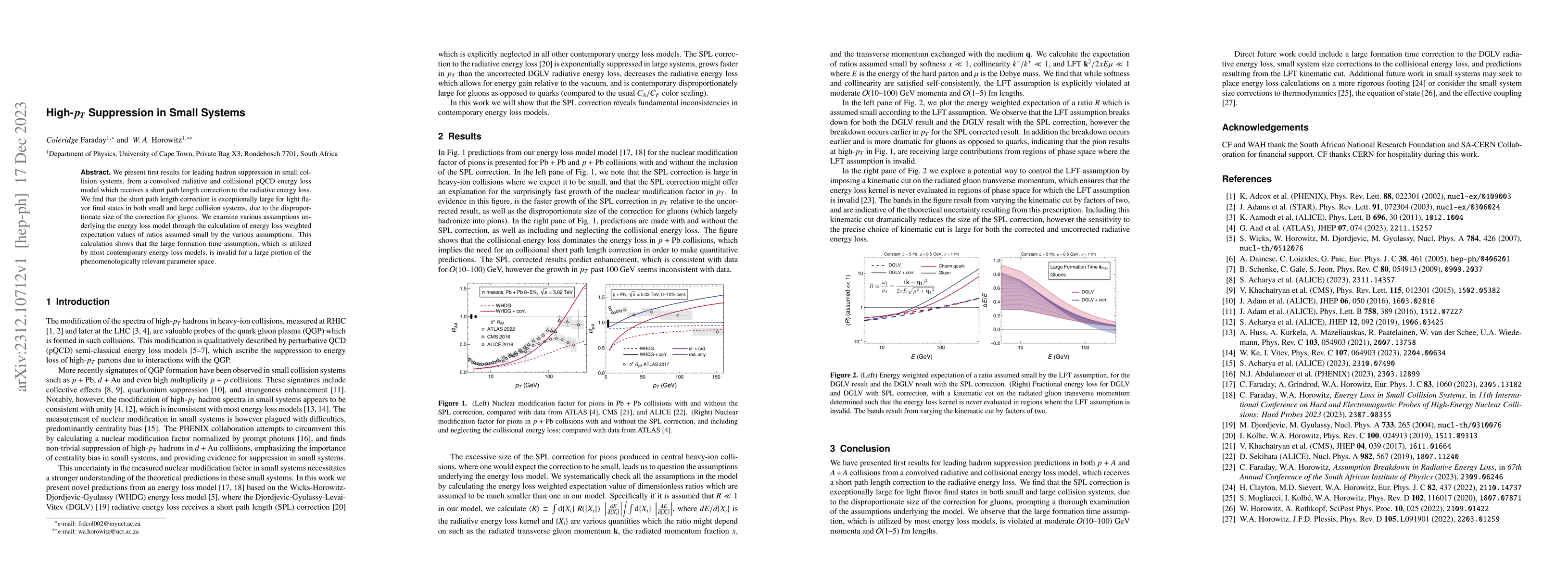 We present first results for leading hadron suppression in small collision systems, from a convolved radiative and collisional pQCD energy loss model which receives a short path length correction to the radiative energy loss. We find that the short path length correction is exceptionally large for light flavor final states in both small and large collision systems, due to the disproportionate size of the correction for gluons. We examine various assumptions underlying the energy loss model through the calculation of energy loss weighted expectation values of ratios assumed small by the various assumptions. This calculation shows that the large formation time assumption, which is utilized by most contemporary energy loss models, is invalid for a large portion of the phenomenologically relevant parameter space.