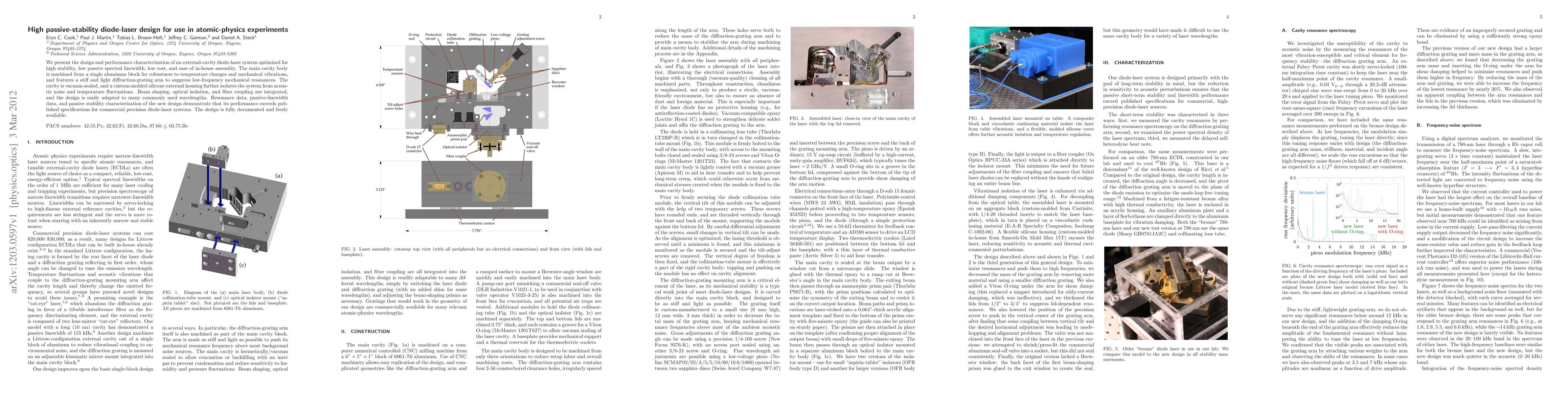 The paper details a diode-laser system design optimized for stability, low spectral linewidth, affordability, and ease of assembly. It features an aluminum cavity for temperature robustness, a grating arm for mechanical resonance suppression, vacuum sealing, and silicone housing for noise and fluctuation isolation. The design integrates beam shaping, optical isolation, and fiber coupling, offering versatile adaptability to various wavelengths. Performance testing surpasses that of commercial precision diode-laser systems, with full documentation freely available.