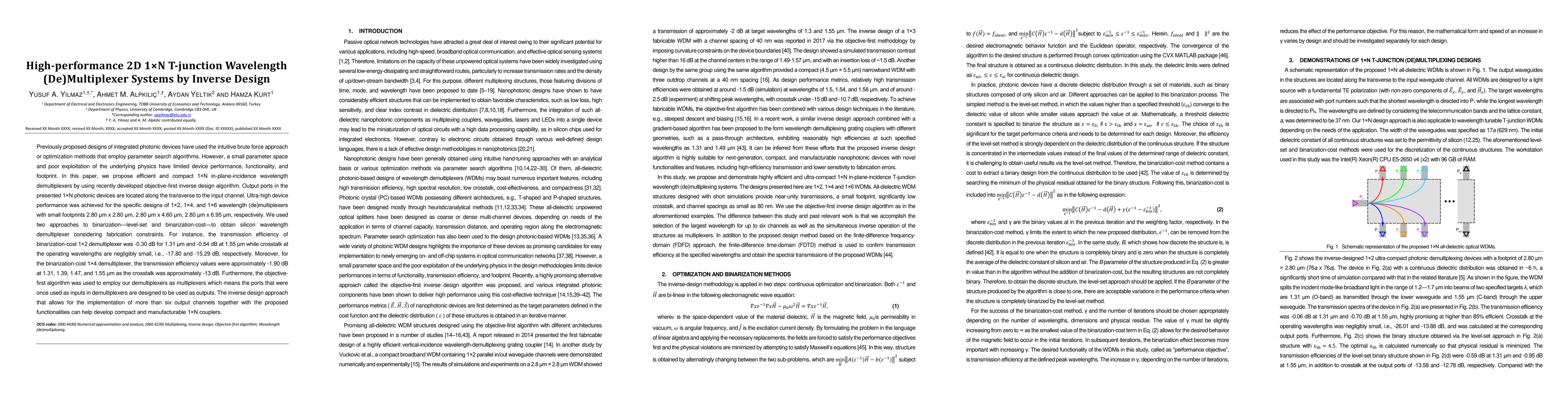 Previously proposed designs of integrated photonic devices have used the intuitive brute force approach or optimization methods that employ parameter search algorithms. However, a small parameter space and poor exploitation of the underlying physics have limited device performance, functionality, and footprint. In this paper, we propose efficient and compact 2D 1xN in-plane-incidence wavelength demultiplexers by using recently developed objective-first inverse design algorithm. Output ports in the presented 1xN photonic devices are located along the transverse to the input channel. Ultra-high device performance was achieved for the specific designs of 1x2, 1x4, and 1x6 wavelength (de)multiplexers with small footprints 2.80 um x 2.80 um, 2.80 um x 4.60 um, 2.80 um x 6.95 um, respectively. We used two approaches to binarization-level-set and binarization-cost-to obtain silicon wavelength demultiplexer considering fabrication constraints. For instance, the transmission efficiency of binarization-cost 1x2 demultiplexer was -0.30 dB for 1.31 um and -0.54 dB at 1.55 um while crosstalk at the operating wavelengths are negligibly small, i.e., -17.80 and -15.29 dB, respectively. Moreover, for the binarization-cost 1x4 demultiplexer, the transmission efficiency values were approximately -1.90 dB at 1.31, 1.39, 1.47, and 1.55 um as the crosstalk was approximately -13 dB. Furthermore, the objective-first algorithm was used to employ our demultiplexers as multiplexers which means the ports that were once used as inputs in demultiplexers are designed to be used as outputs. The inverse design approach that allows for the implementation of more than six output channels together with the proposed functionalities can help develop compact and manufacturable 2D 1xN couplers.