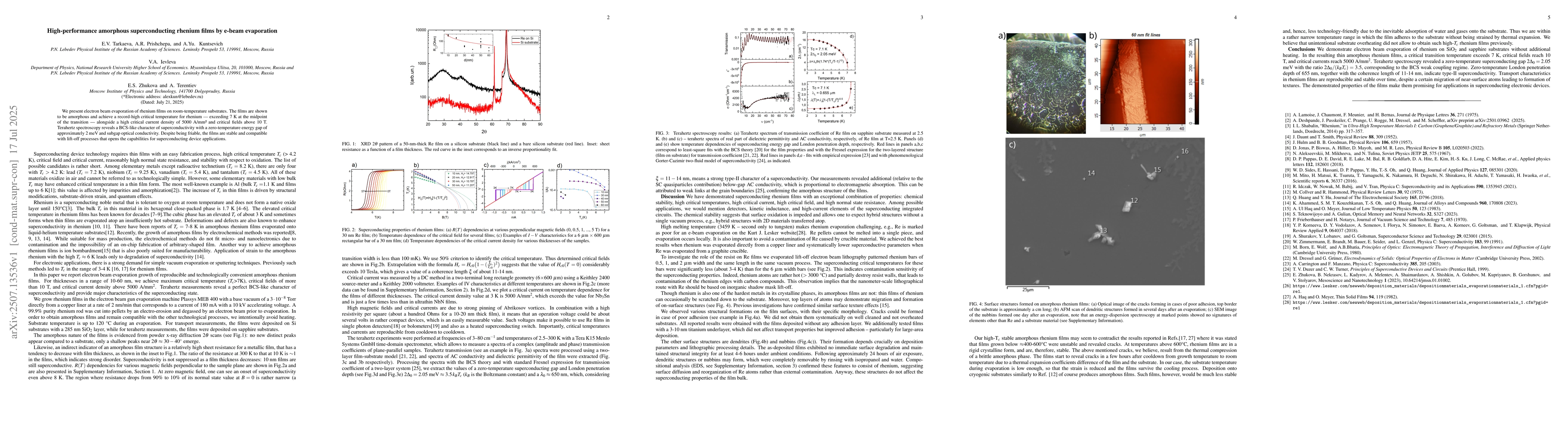 We present electron beam evaporation of rhenium films on room-temperature substrates. The films are shown to be amorphous and achieve a record-high critical temperature for rhenium - exceeding 7 K at the midpoint of the transition - alongside a high critical current density of 5000 A/mm^2 and critical fields above 10 T. Terahertz spectroscopy reveals a BCS-like character of superconductivity with a zero-temperature energy gap of approximately 2 meV and subgap optical conductivity. Despite being friable, the films are stable and compatible with lift-off processes that opens the capabilities for superconducting device applications.