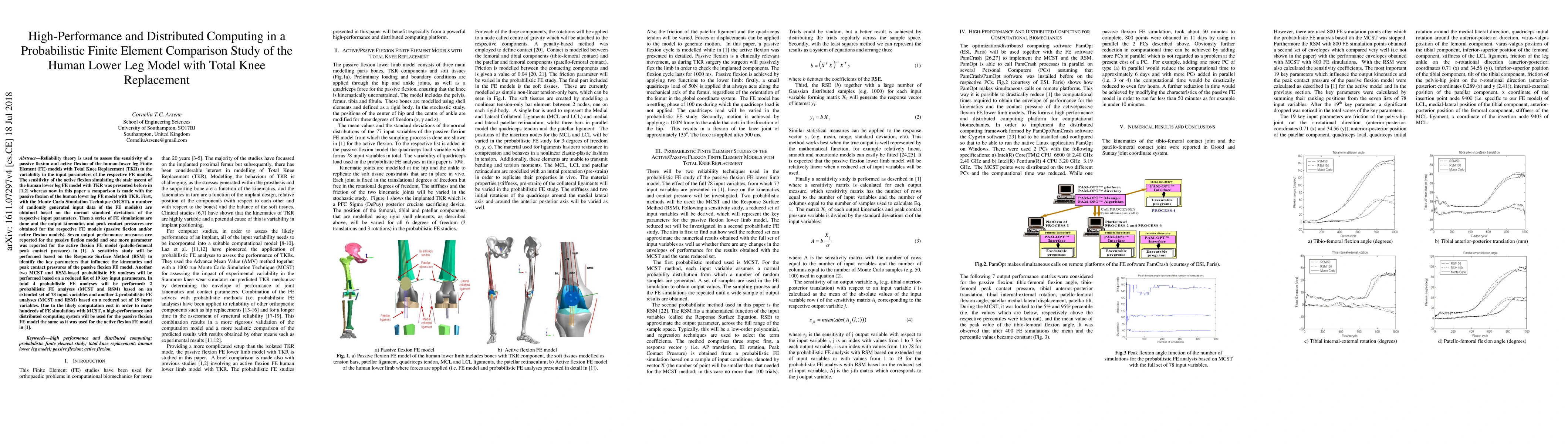 Reliability theory is used to assess the sensitivity of a passive flexion and active flexion of the human lower leg Finite Element (FE) models with Total Knee Replacement (TKR) to the variability in the input parameters of the respective FE models. The sensitivity of the active flexion simulating the stair ascent of the human lower leg FE model with TKR was presented before in [1,2] whereas now in this paper a comparison is made with the passive flexion of the human lower leg FE model with TKR. First, with the Monte Carlo Simulation Technique (MCST), a number of randomly generated input data of the FE model(s) are obtained based on the normal standard deviations of the respective input parameters. Then a series of FE simulations are done and the output kinematics and peak contact pressures are obtained for the respective FE models (passive flexion and/or active flexion models). Seven output performance measures are reported for the passive flexion model and one more parameter was reported for the active flexion FE model (patello-femoral peak contact pressure) in [1]. A sensitivity study will be performed based on the Response Surface Method (RSM) to identify the key parameters that influence the kinematics and peak contact pressures of the passive flexion FE model. Another two MCST and RSM-based probabilistic FE analyses will be performed based on a reduced list of 19 key input parameters. In total 4 probabilistic FE analyses will be performed: 2 probabilistic FE analyses (MCST and RSM) based on an extended set of 78 input variables and another 2 probabilistic FE analyses (MCST and RSM) based on a reduced set of 19 input variables. Due to the likely computation cost in order to make hundreds of FE simulations with MCST, a high-performance and distributed computing system will be used for the passive flexion FE model the same as it was used for the active flexion FE model in [1].