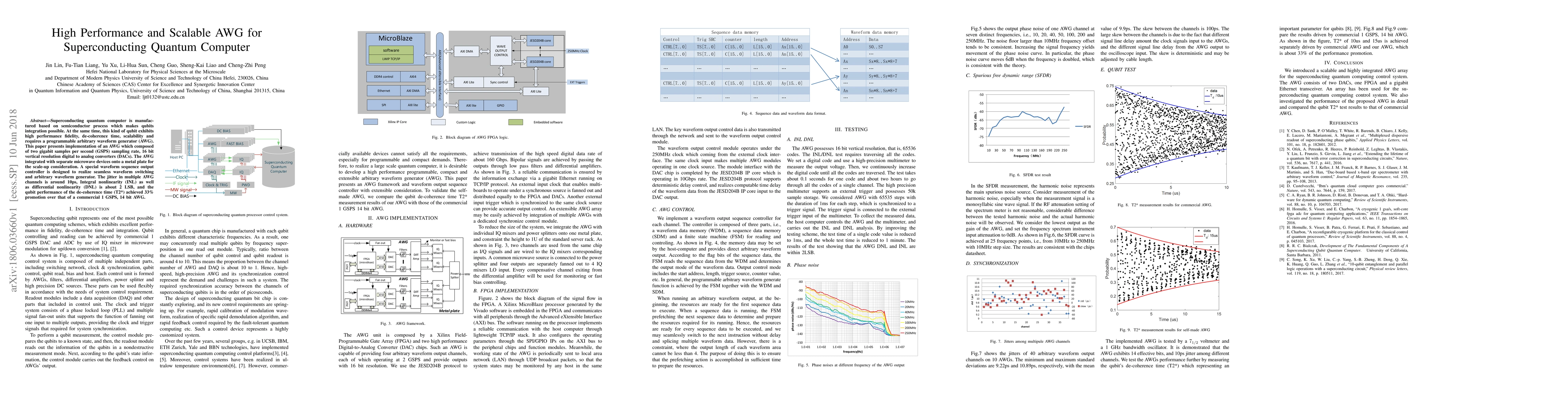 Superconducting quantum computer is manufactured based on semiconductor process which makes qubits integration possible. At the same time, this kind of qubit exhibits high performance fidelity, de-coherence time, scalability and requires a programmable arbitrary waveform generator (AWG). This paper presents implementation of an AWG which composed of two gigabit samples per second (GSPS) sampling rate, 16 bit vertical resolution digital to analog converters (DACs). The AWG integrated with separate microwave devices onto a metal plate for the scale-up consideration. A special waveform sequence output controller is designed to realize seamless waveform switching and arbitrary waveform generator. The jitter in multiple AWG channels is around 10ps, Integral nonlinearity (INL) as well as differential nonlinearity (DNL) is about 2 LSB, and the qubit performance of the de-coherence time (T2*) achieved 33% promotion over that of a commercial 1 GSPS, 14 bit AWG.