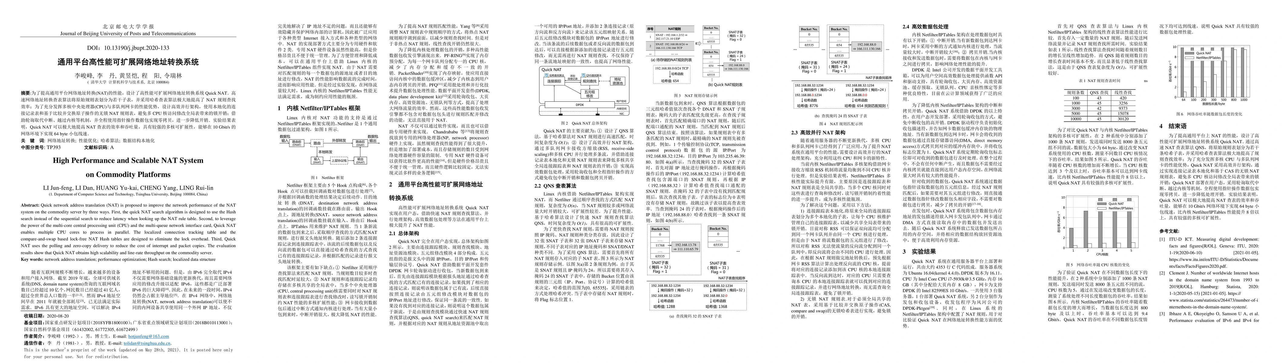This paper proposes a high-performance and scalable NAT system called Quick NAT for commodity servers, utilizing a hash search algorithm, parallel processing, and zero-copy delivery to achieve high scalability and line-rate throughput. The evaluation demonstrates significant improvements over traditional NAT methods.