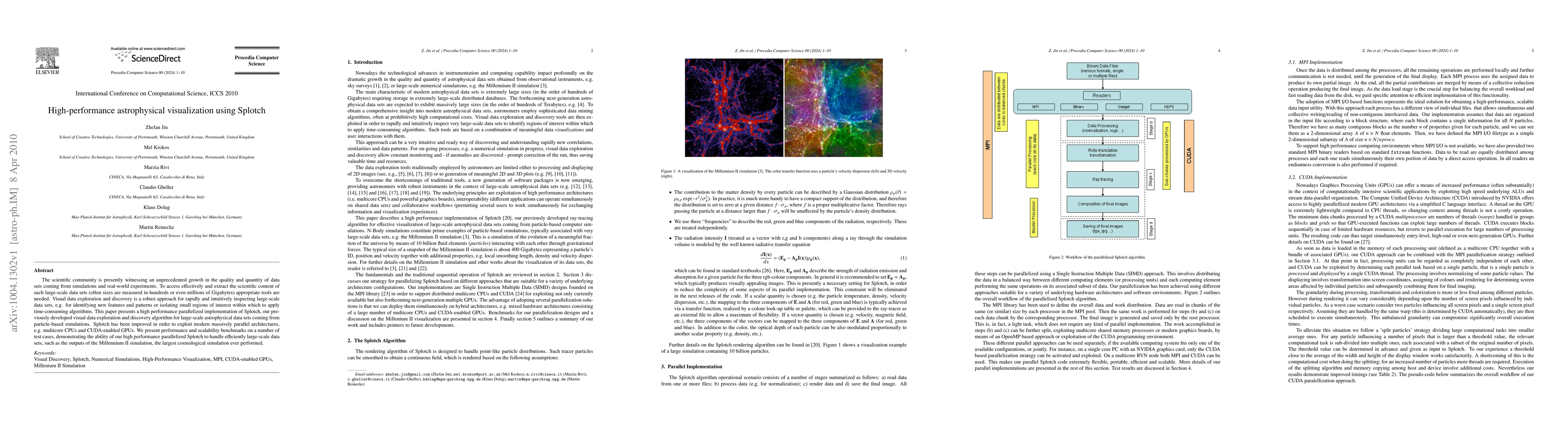 This paper introduces a high-performance parallelized version of Splotch, a visual data exploration algorithm for large-scale astrophysical datasets, optimized for modern multicore CPUs and GPUs. The enhanced Splotch efficiently handles massive data sets, as demonstrated by performance benchmarks on the Millennium II simulation.