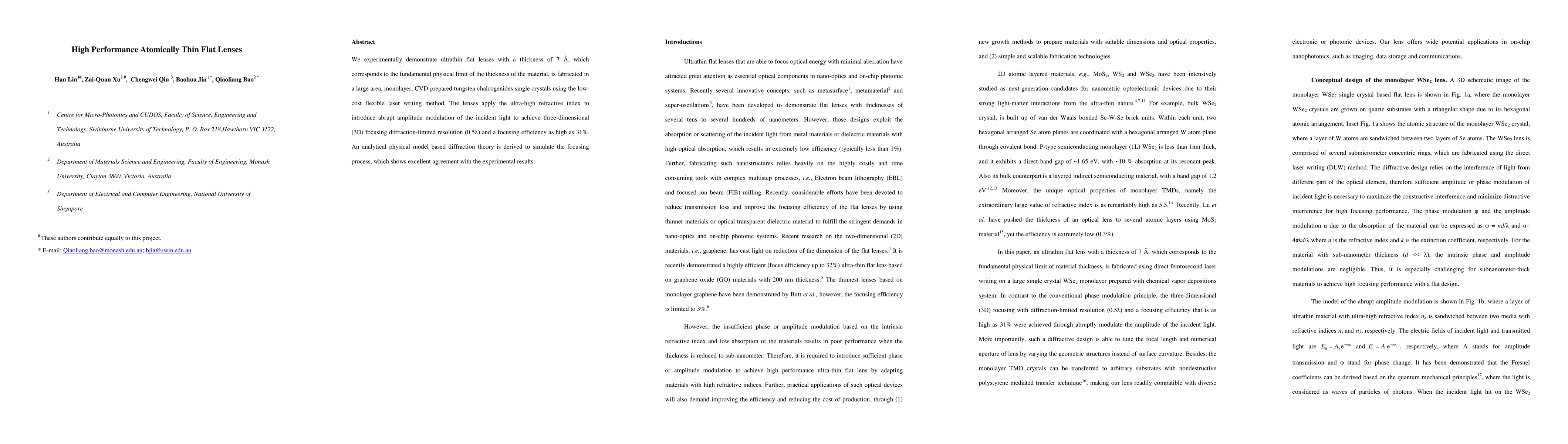 Researchers created ultra-thin, flexible flat lenses made of tungsten chalcogenides that focus light with high resolution and efficiency, opening new possibilities for 3D imaging and optical applications.