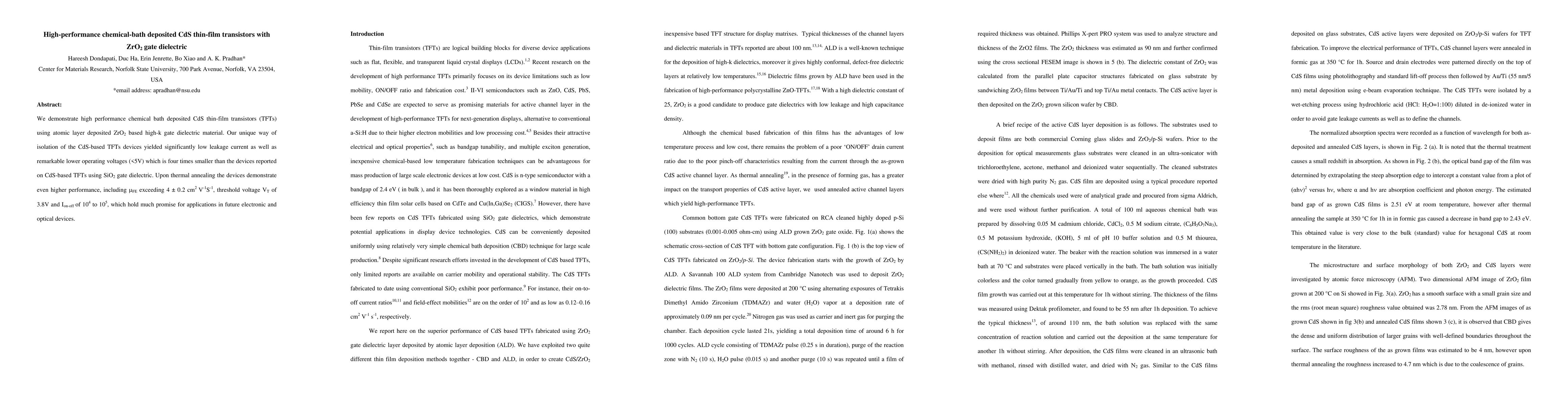 Summary: High-performance CdS thin-film transistors (TFTs) are demonstrated using chemical bath deposition and an atomic layer deposited ZrO2 gate dielectric for enhanced performance. The use of high-k ZrO2 improves the overall efficiency of the TFTs.