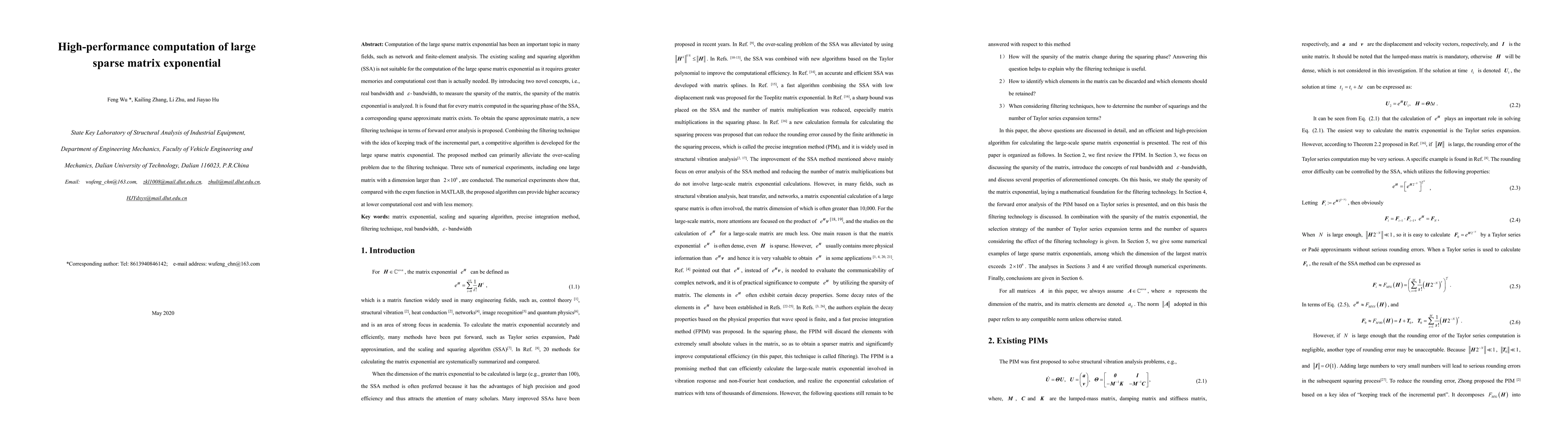The paper proposes a new algorithm for computing the exponential of large sparse matrices, addressing the limitations of existing scaling and squaring methods. It introduces a filtering technique based on real bandwidth and sparsity analysis to achieve higher accuracy and lower computational cost and memory usage.
