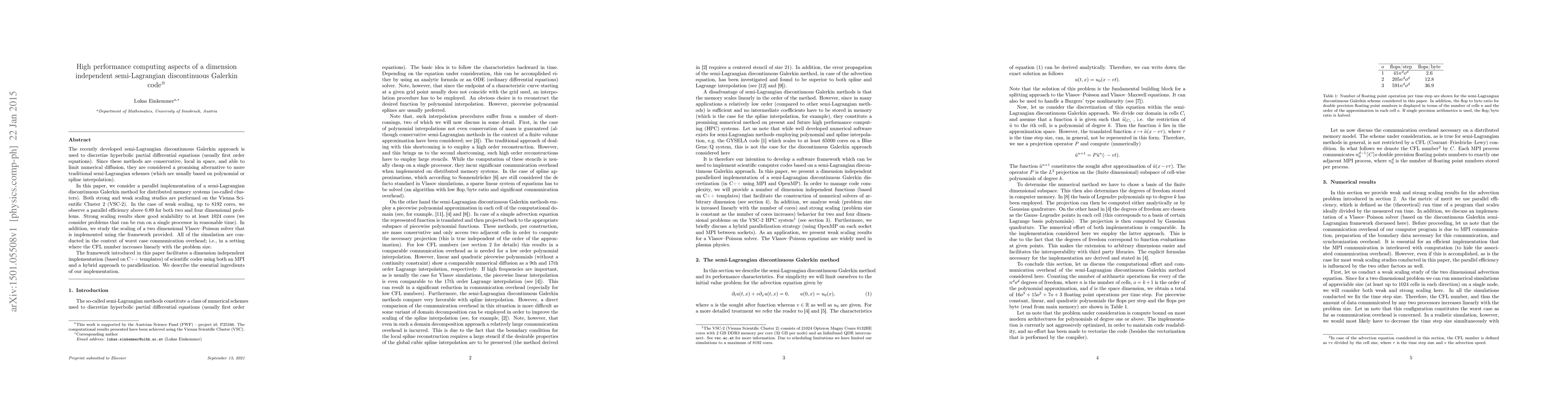 This paper explores a parallel implementation of a semi-Lagrangian discontinuous Galerkin method for high-performance computing on distributed memory systems, achieving high parallel efficiency and scalability up to 8192 cores. The framework supports dimension-independent, MPI-based parallelization and demonstrates effective performance for solving hyperbolic PDEs.