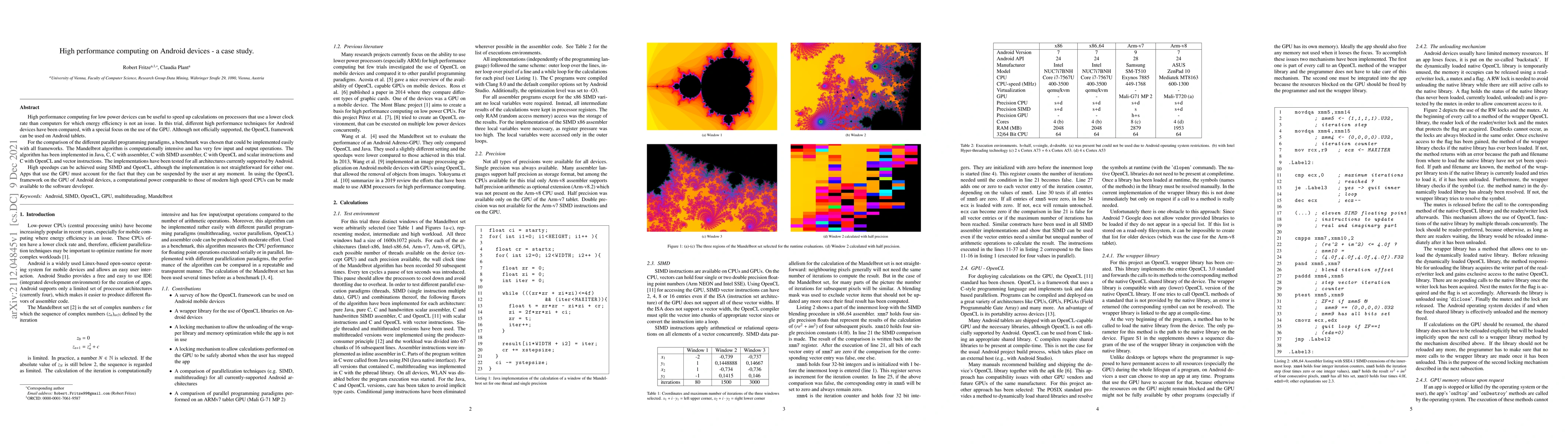 This paper investigates high performance computing techniques on Android devices, focusing on GPU-based OpenCL frameworks. Various implementations of the Mandelbrot algorithm were benchmarked, showing significant speedups with SIMD and OpenCL, despite the challenges in their implementation.