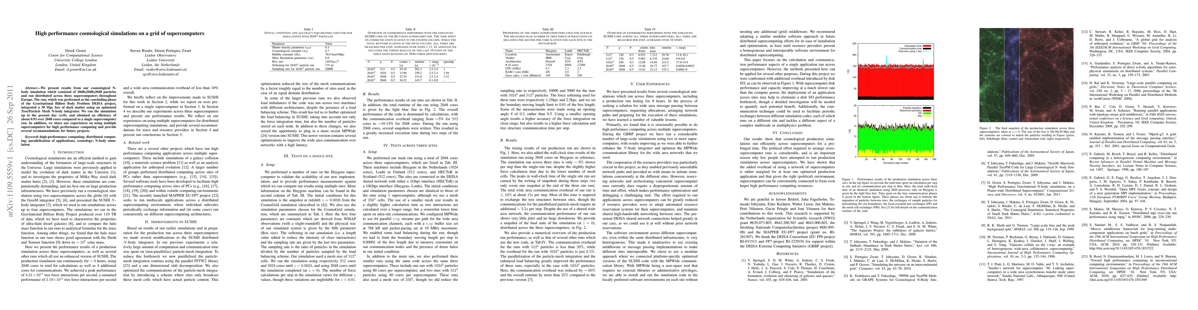 This research presents high-performance cosmological simulations of a 30 Mpc box of dark matter using 2048x2048x2048 particles across three European supercomputers, achieving an efficiency of 0.93 over 2048 cores. The study also offers insights and recommendations for future high-performance computing projects.