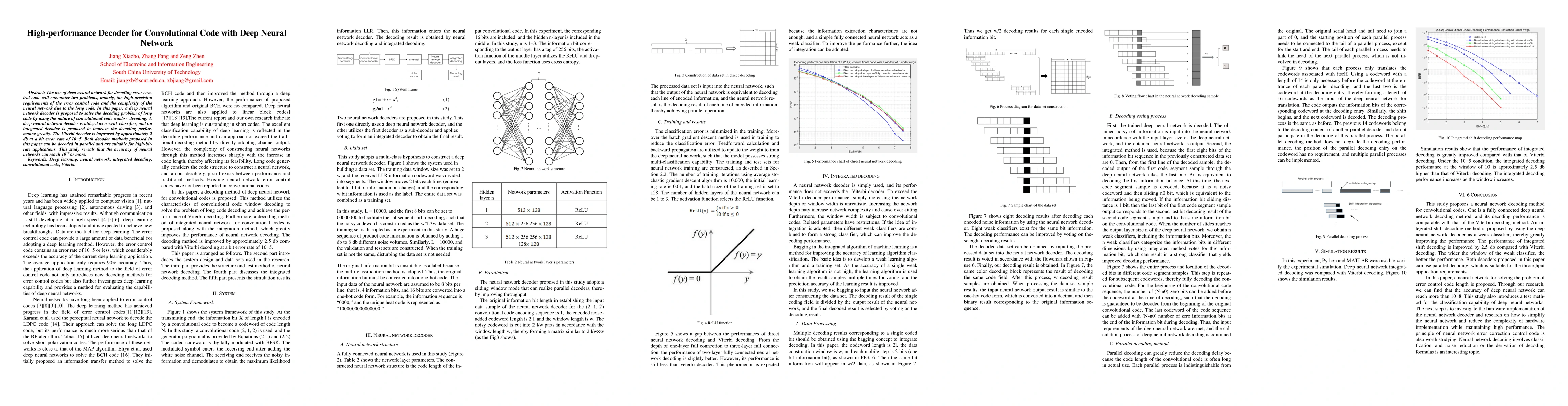 The use of deep neural network for decoding error control code will encounter two problems, namely, the high-precision requirements of the error control code and the complexity of the neural network due to the long code. In this paper, a deep neural network decoder is proposed to solve the decoding problem of long code by using the nature of convolutional code window decoding. A deep neural network decoder is utilized as a weak classifier, and an integrated decoder is proposed to improve the decoding performance greatly. The Viterbi decoder is improved by approximately 2 db at a bit error rate of level 5. Both decoder methods proposed in this paper can be decoded in parallel and are suitable for high-bit-rate applications. This study reveals that the accuracy of neural networks can reach level 8 more.