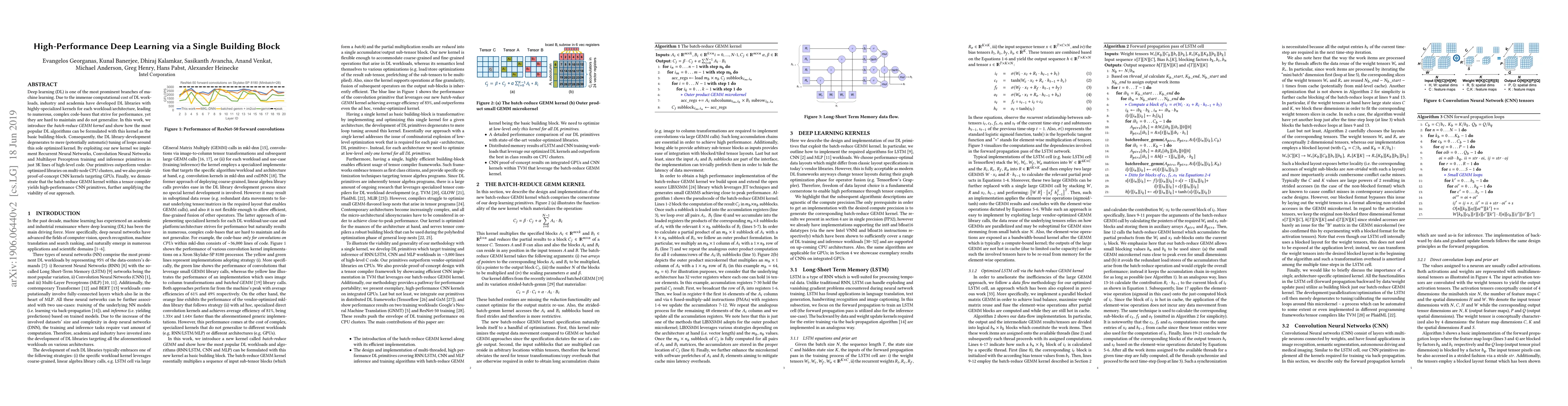 Deep learning (DL) is one of the most prominent branches of machine learning. Due to the immense computational cost of DL workloads, industry and academia have developed DL libraries with highly-specialized kernels for each workload/architecture, leading to numerous, complex code-bases that strive for performance, yet they are hard to maintain and do not generalize. In this work, we introduce the batch-reduce GEMM kernel and show how the most popular DL algorithms can be formulated with this kernel as the basic building-block. Consequently, the DL library-development degenerates to mere (potentially automatic) tuning of loops around this sole optimized kernel. By exploiting our new kernel we implement Recurrent Neural Networks, Convolution Neural Networks and Multilayer Perceptron training and inference primitives in just 3K lines of high-level code. Our primitives outperform vendor-optimized libraries on multi-node CPU clusters, and we also provide proof-of-concept CNN kernels targeting GPUs. Finally, we demonstrate that the batch-reduce GEMM kernel within a tensor compiler yields high-performance CNN primitives, further amplifying the viability of our approach.