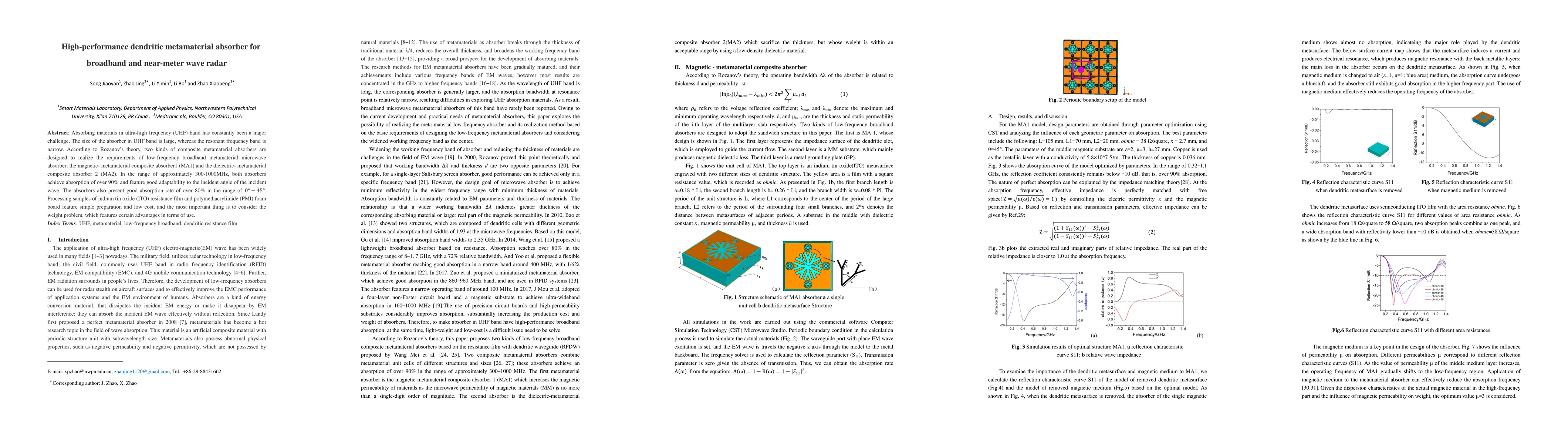 This research develops high-performance dendritic metamaterial absorbers for broadband UHF band applications, achieving over 90% absorption from 300-1000MHz and maintaining efficiency across varying incident angles, with materials like ITO and PMI offering cost-effective and lightweight solutions.