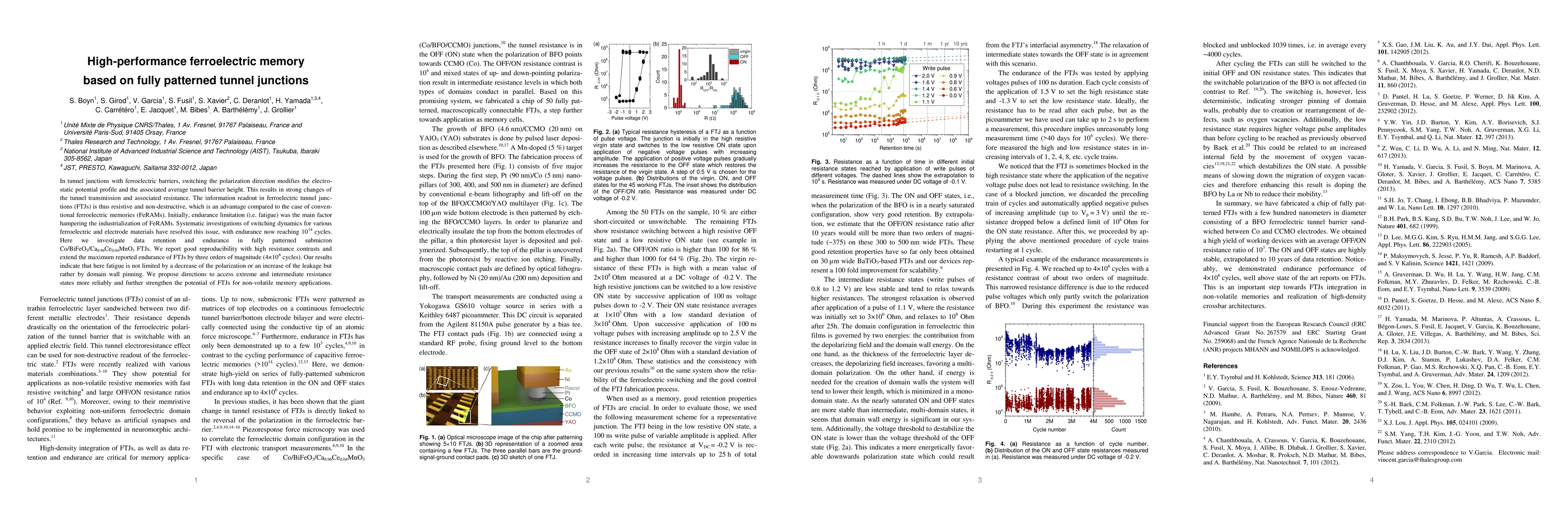 The research focuses on high-performance ferroelectric memory using fully patterned tunnel junctions. It reports significant improvements in data retention and endurance, reaching 4*10^6 cycles, by overcoming fatigue through understanding domain wall pinning. This advances the potential of ferroelectric tunnel junctions for non-volatile memory applications.