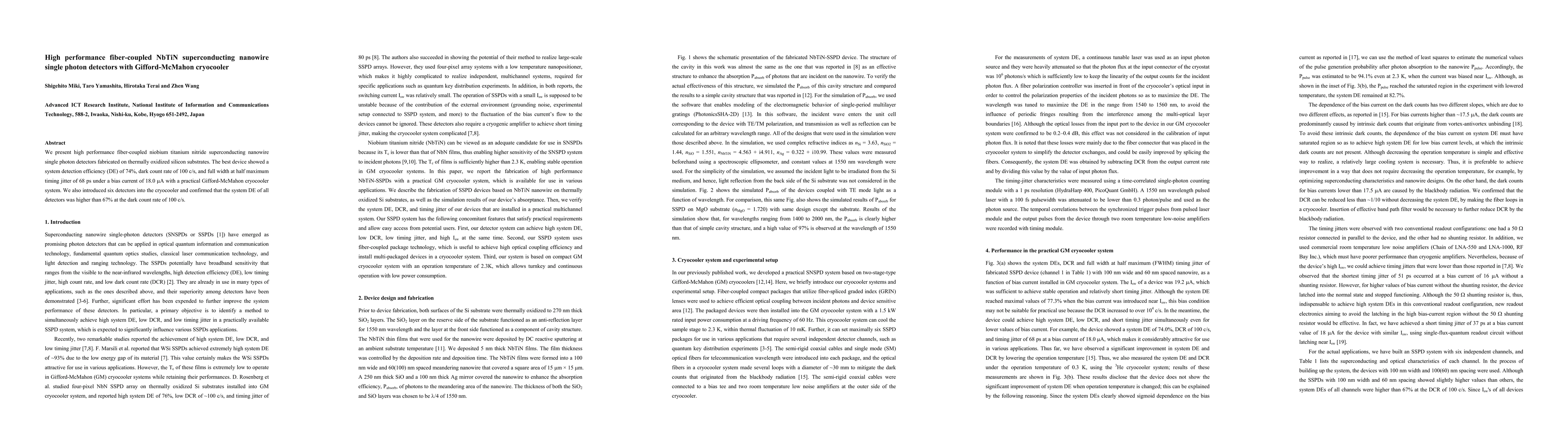 This paper reports high-performance fiber-coupled NbTiN superconducting nanowire single photon detectors achieving a system detection efficiency of 74% and a dark count rate of 100 c/s, with a timing jitter of 68 ps, all maintained with a Gifford-McMahon cryocooler. The study also demonstrates consistent performance across six detectors in the cryocooler setup.