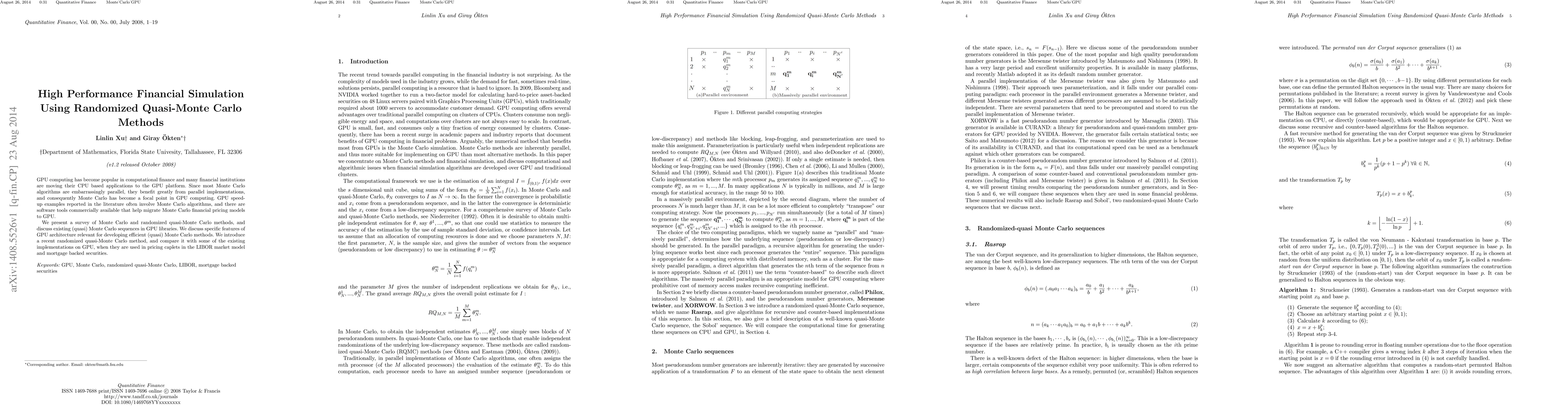 GPU computing has become popular in computational finance and many financial institutions are moving their CPU based applications to the GPU platform. Since most Monte Carlo algorithms are embarrassingly parallel, they benefit greatly from parallel implementations, and consequently Monte Carlo has become a focal point in GPU computing. GPU speed-up examples reported in the literature often involve Monte Carlo algorithms, and there are software tools commercially available that help migrate Monte Carlo financial pricing models to GPU. We present a survey of Monte Carlo and randomized quasi-Monte Carlo methods, and discuss existing (quasi) Monte Carlo sequences in GPU libraries. We discuss specific features of GPU architecture relevant for developing efficient (quasi) Monte Carlo methods. We introduce a recent randomized quasi-Monte Carlo method, and compare it with some of the existing implementations on GPU, when they are used in pricing caplets in the LIBOR market model and mortgage backed securities.
