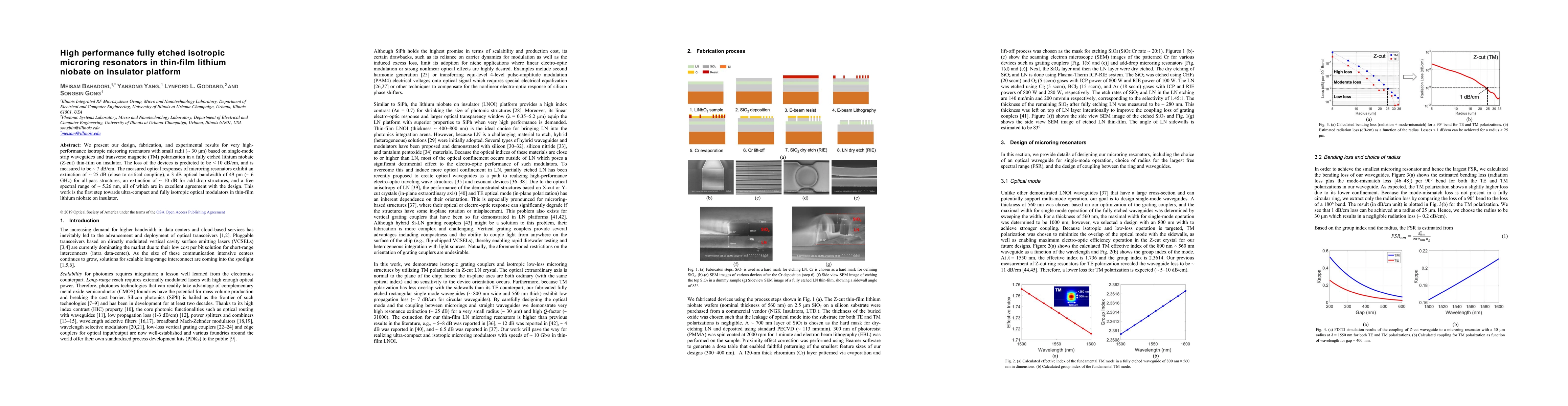 This paper describes the design and fabrication of high-performance isotropic microring resonators in thin-film lithium niobate on insulator, achieving low loss (~7 dB/cm), high extinction ratios (~25 dB), and compact bandwidths (~49 pm), marking a significant step toward ultra-compact optical modulators.