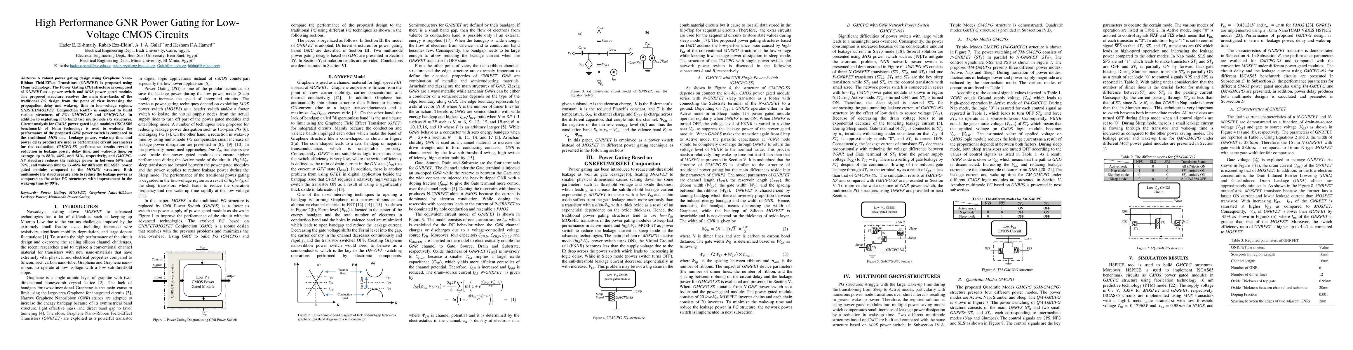 This paper proposes a high-performance power gating design using Graphene Nano-Ribbon Field Effect Transistors (GNRFET) for low-voltage CMOS circuits, aiming to reduce propagation delay and wake-up time. The proposed GNRFET/MOSFET Conjunction (GMC) structures outperform traditional MOS power gating in terms of leakage power, wake-up time, and power delay product.