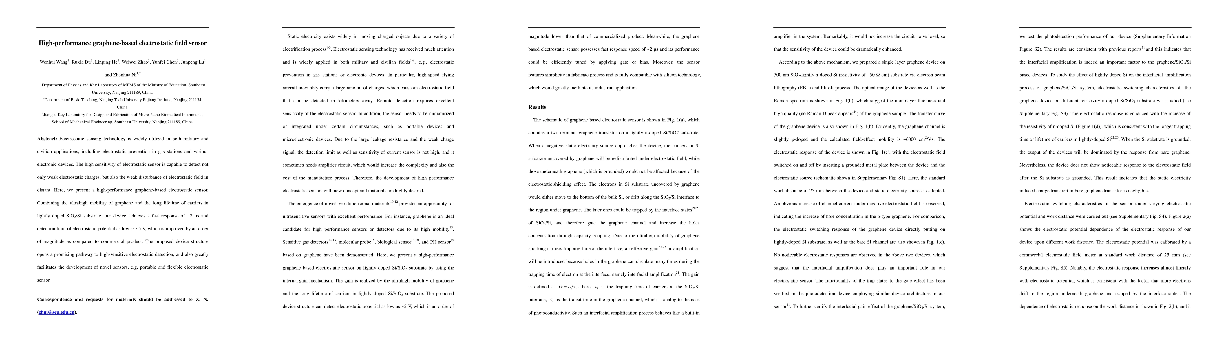 This paper presents a high-performance graphene-based electrostatic sensor with ultrahigh sensitivity, achieving a fast response time of ~2 us and a detection limit of ~5 V, significantly outperforming commercial products. The design leverages graphene's mobility and carrier lifetime in a SiO2/Si substrate, promising advancements in sensitive electrostatic detection and flexible sensor development.