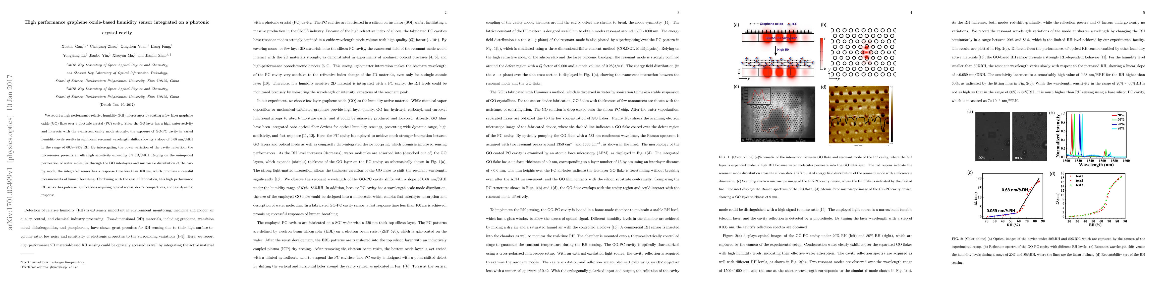 This paper introduces a high-performance graphene oxide-based humidity sensor integrated on a photonic crystal cavity, demonstrating ultrahigh sensitivity and fast response time, with potential applications in human breathing measurements and compact optical devices.