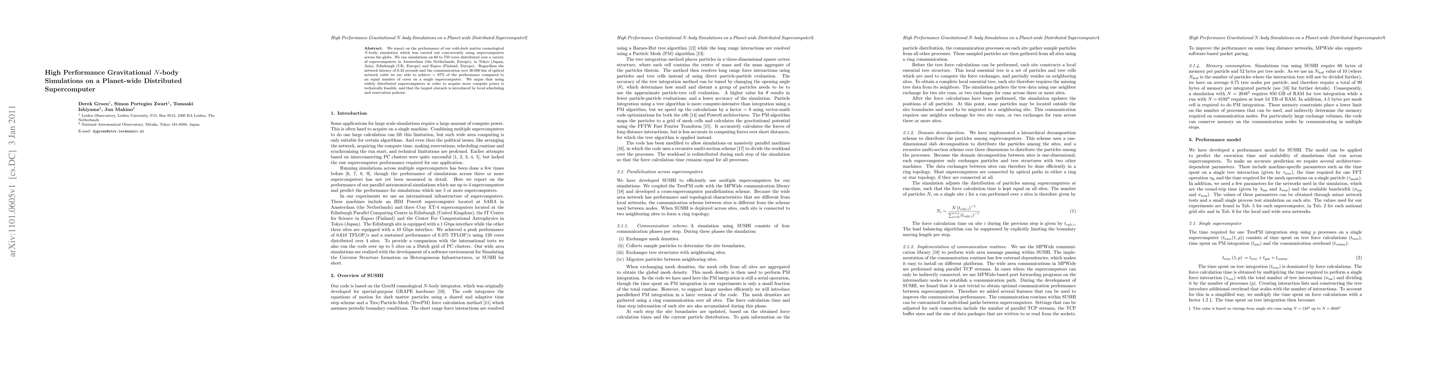 This paper reports on high-performance gravitational N-body simulations conducted across a planet-wide distributed network of supercomputers, achieving 87% of performance compared to a single supercomputer despite network latency and distance. The study highlights the feasibility of using distributed systems for large-scale simulations, noting that local scheduling policies are the main challenge.
