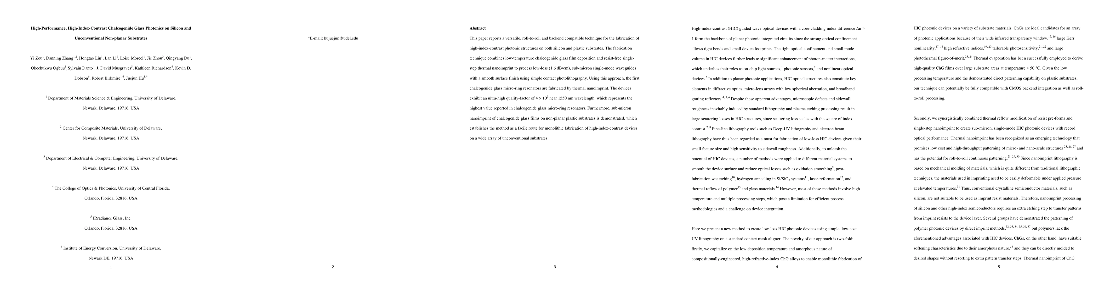 This paper reports a versatile, roll-to-roll and backend compatible technique for the fabrication of high-index-contrast photonic structures on both silicon and plastic substrates. The fabrication technique combines low-temperature chalcogenide glass film deposition and resist-free single-step thermal nanoimprint to process low-loss (1.6 dB/cm), sub-micron single-mode waveguides with a smooth surface finish using simple contact photolithography. Using this approach, the first chalcogenide glass micro-ring resonators are fabricated by thermal nanoimprint. The devices exhibit an ultra-high quality-factor of 400,000 near 1550 nm wavelength, which represents the highest value reported in chalcogenide glass micro-ring resonators. Furthermore, sub-micron nanoimprint of chalcogenide glass films on non-planar plastic substrates is demonstrated, which establishes the method as a facile route for monolithic fabrication of high-index-contrast devices on a wide array of unconventional substrates.