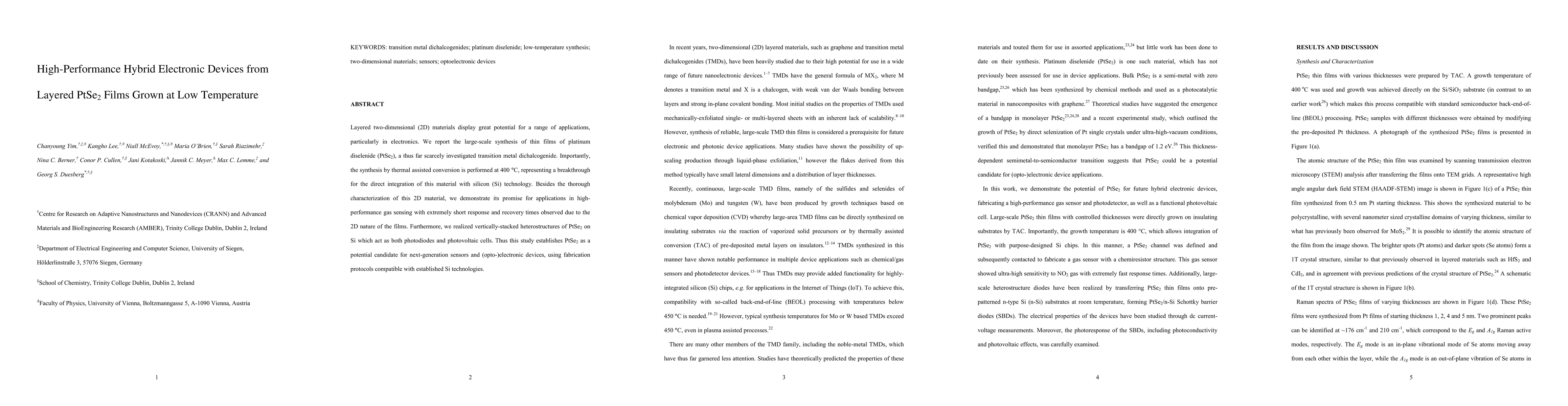 Layered two-dimensional (2D) materials display great potential for a range of applications, particularly in electronics. We report the large-scale synthesis of thin films of platinum diselenide (PtSe2), a thus far scarcely investigated transition metal dichalcogenide. Importantly, the synthesis by thermal assisted conversion is performed at 400 {\deg}C, representing a breakthrough for the direct integration of this novel material with silicon (Si) technology. Besides the thorough characterization of this new 2D material, we demonstrate its promise for applications in high-performance gas sensing with extremely short response and recovery times observed due to the 2D nature of the films. Furthermore, we realized vertically-stacked heterostructures of PtSe2 on Si which act as both photodiodes and photovoltaic cells. Thus this study establishes PtSe2 as a potential candidate for next-generation sensors and (opto-)electronic devices, using fabrication protocols compatible with established Si technologies.