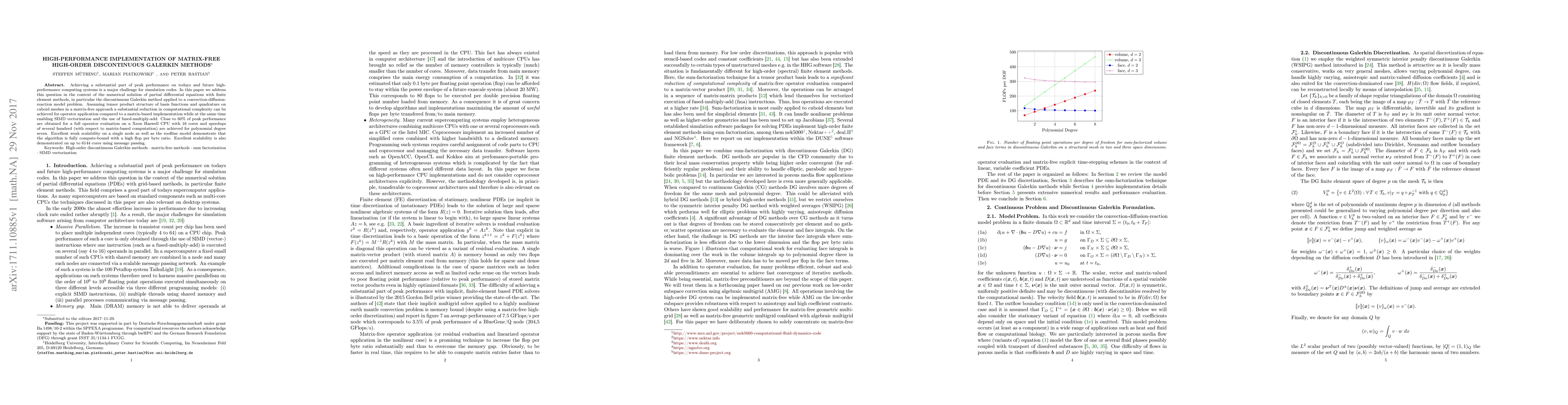 This research presents a high-performance implementation of matrix-free high-order Discontinuous Galerkin methods for solving PDEs, achieving near-peak CPU performance and significant speedups over matrix-based methods, especially for higher polynomial degrees. The method demonstrates excellent weak and strong scalability on multi-core and message-passing systems, respectively.