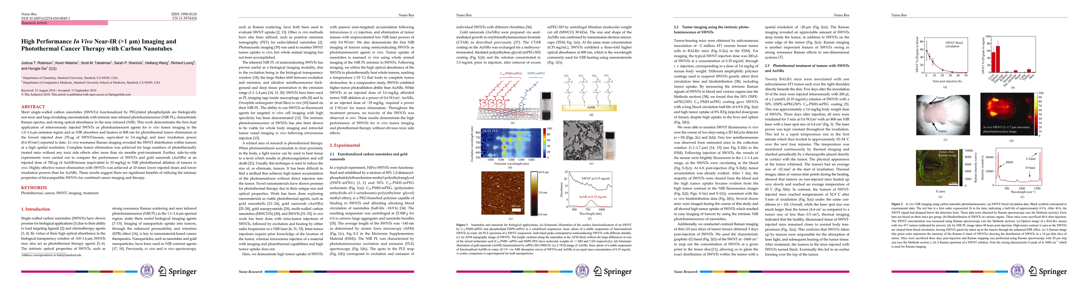 This paper demonstrates the use of functionalized, non-toxic single-walled carbon nanotubes (SWNTs) for high-performance in vivo near-infrared imaging and photothermal cancer therapy, achieving complete tumor elimination at significantly lower doses and lower laser powers compared to gold nanorods.