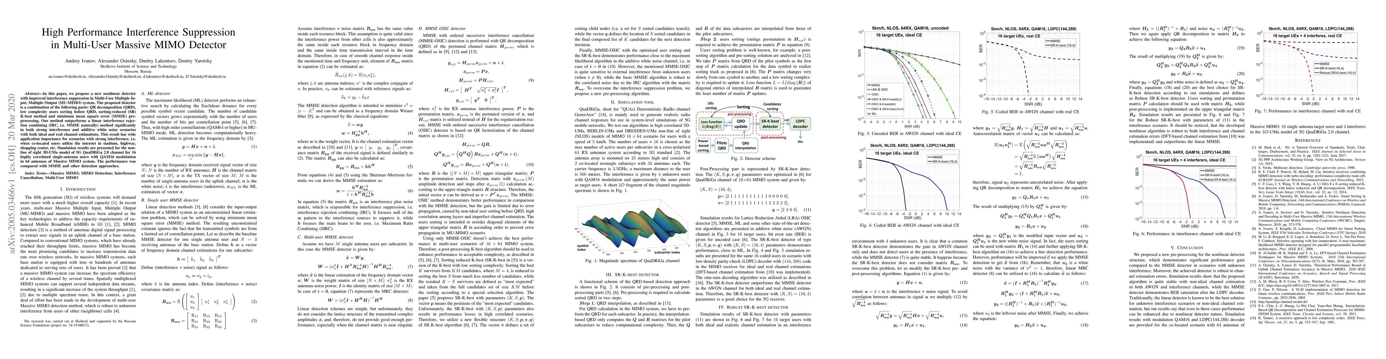 In this paper, we propose a new nonlinear detector with improved interference suppression in Multi-User Multiple Input, Multiple Output (MU-MIMO) system. The proposed detector is a combination of the following parts: QR decomposition (QRD), low complexity users sorting before QRD, sorting-reduced (SR) K-best method and minimum mean square error (MMSE) pre-processing. Our method outperforms a linear interference rejection combining (IRC, i.e. MMSE naturally) method significantly in both strong interference and additive white noise scenarios with both ideal and real channel estimations. This result has wide application importance for scenarios with strong interference, i.e. when co-located users utilize the internet in stadium, highway, shopping center, etc. Simulation results are presented for the non-line of sight 3D-UMa model of 5G QuaDRiGa 2.0 channel for 16 highly correlated single-antenna users with QAM16 modulation in 64 antennas of Massive MIMO system. The performance was compared with MMSE and other detection approaches.
