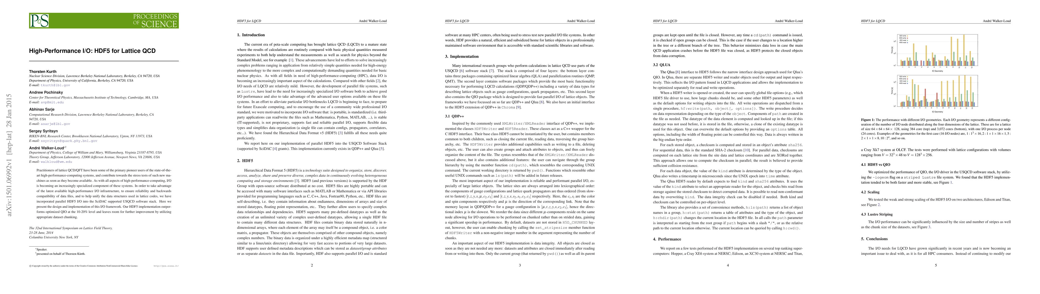 This paper discusses the integration of parallel HDF5 I/O into the USQCD software stack for lattice QCD computations, achieving 10-20% better performance compared to optimized QIO, with potential for further enhancements through dataset chunking.