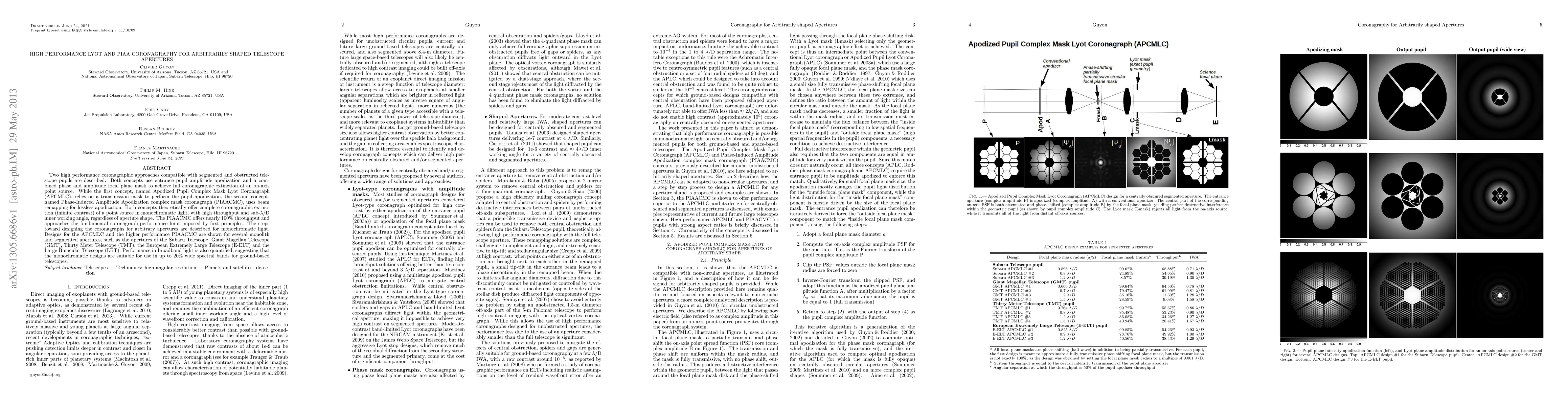 This paper describes two high-performance coronagraphic techniques, the APCMLC and PIAACMC, designed for segmented and obstructed telescope apertures. Both achieve full extinction of on-axis light sources with high throughput and minimal inner working angles, while the PIAACMC offers nearly 100% throughput and broadband performance suitable for up to 20% wide spectral bands.