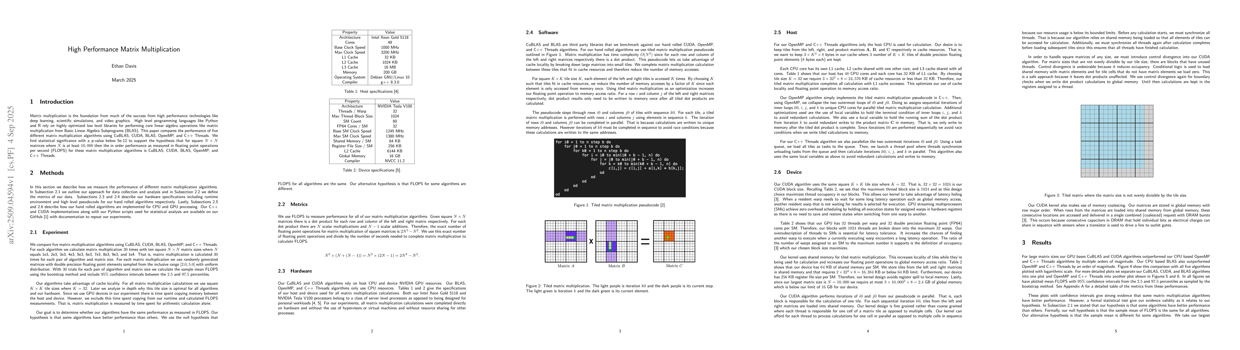 Matrix multiplication is the foundation from much of the success from high performance technologies like deep learning, scientific simulations, and video graphics. High level programming languages like Python and R rely on highly optimized low level libraries for performing core linear algebra operations like matrix multiplication from Basic Linear Algebra Subprograms (BLAS). This paper compares the performance of five different matrix multiplication algorithms using CuBLAS, CUDA, BLAS, OpenMP, and C++ Threads. We find statistical significance with a p-value below 5e-12 to support the hypothesis that for square $N \times N$ matrices where $N$ is at least 10,000 then the in order performance as measured in floating point operations per second (FLOPS) for these matrix multiplication algorithms is CuBLAS, CUDA, BLAS, OpenMP, and C++ Threads.