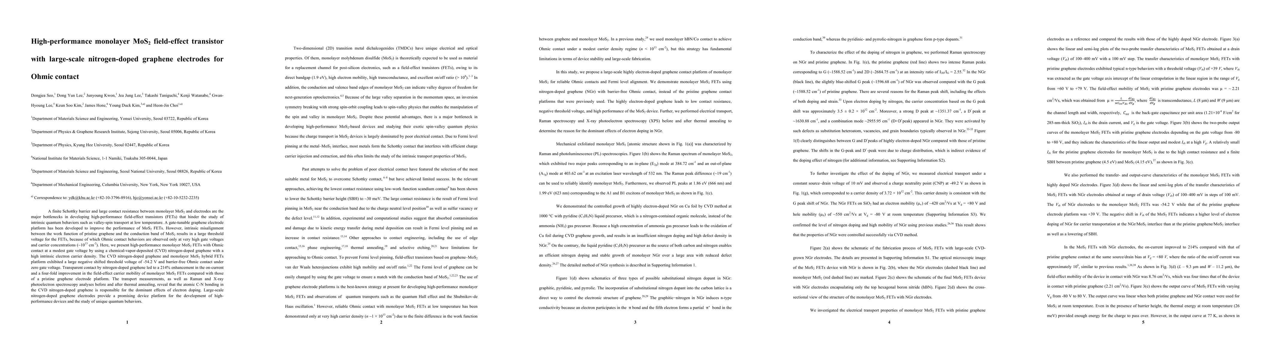 This paper presents a high-performance monolayer MoS2 FET with large-scale nitrogen-doped graphene electrodes, achieving Ohmic contact at modest gate voltages and significantly enhancing on-current and carrier mobility. The nitrogen doping in graphene is identified as the key factor for improved device performance.