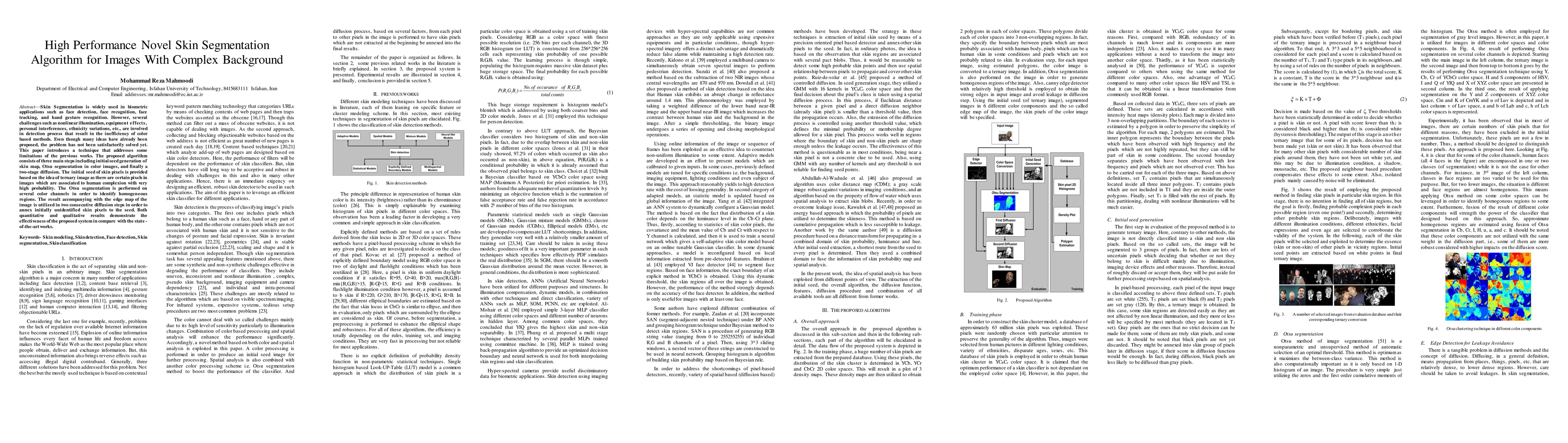 This paper introduces a novel skin segmentation algorithm that addresses challenges such as nonlinear illumination and ethnicity variations in biometric applications like face detection and recognition. The proposed algorithm achieves high performance through three main steps: seed generation, Otsu segmentation, and two-stage diffusion.