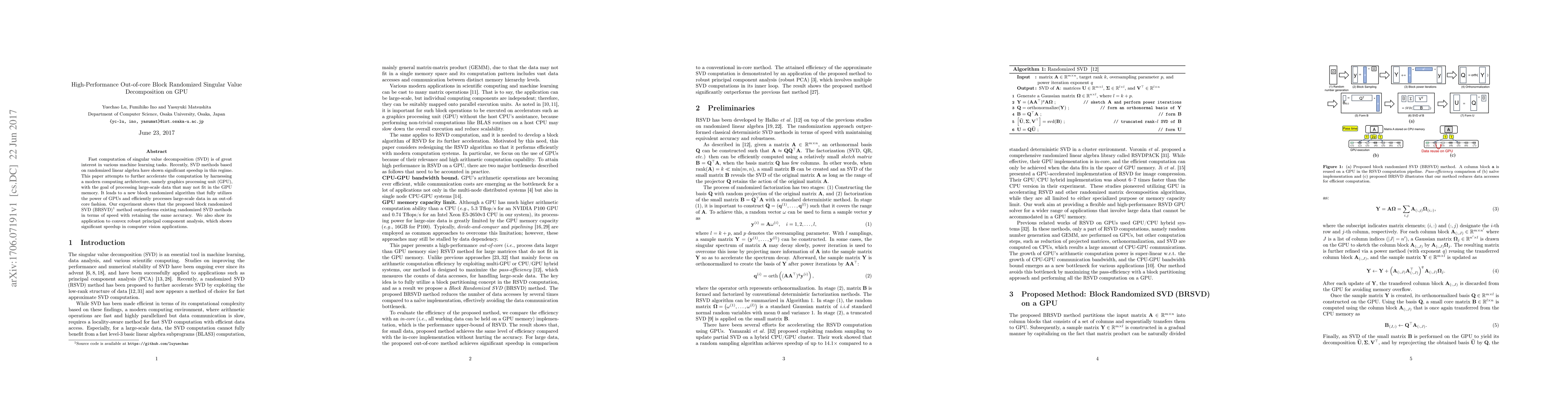 Fast computation of singular value decomposition (SVD) is of great interest in various machine learning tasks. Recently, SVD methods based on randomized linear algebra have shown significant speedup in this regime. This paper attempts to further accelerate the computation by harnessing a modern computing architecture, namely graphics processing unit (GPU), with the goal of processing large-scale data that may not fit in the GPU memory. It leads to a new block randomized algorithm that fully utilizes the power of GPUs and efficiently processes large-scale data in an out-of- core fashion. Our experiment shows that the proposed block randomized SVD (BRSVD) method outperforms existing randomized SVD methods in terms of speed with retaining the same accuracy. We also show its application to convex robust principal component analysis, which shows significant speedup in computer vision applications.