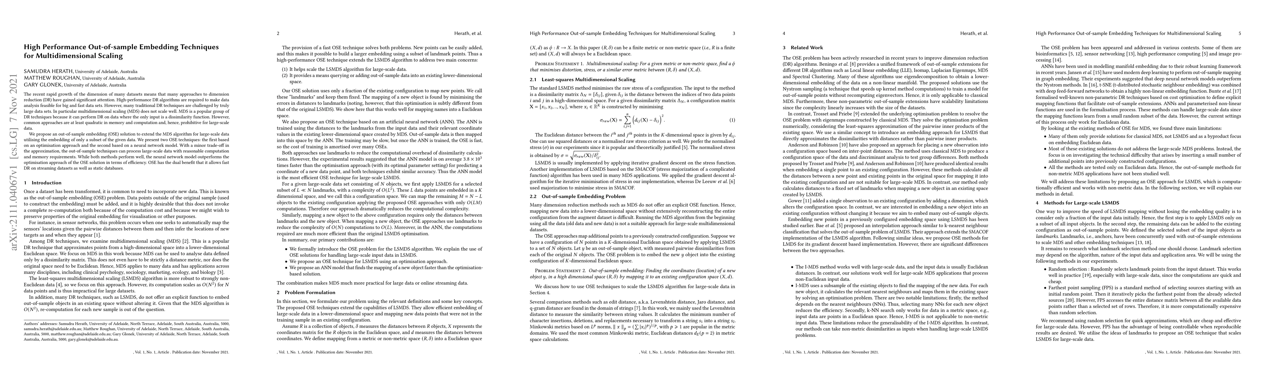The recent rapid growth of the dimension of many datasets means that many approaches to dimension reduction (DR) have gained significant attention. High-performance DR algorithms are required to make data analysis feasible for big and fast data sets. However, many traditional DR techniques are challenged by truly large data sets. In particular multidimensional scaling (MDS) does not scale well. MDS is a popular group of DR techniques because it can perform DR on data where the only input is a dissimilarity function. However, common approaches are at least quadratic in memory and computation and, hence, prohibitive for large-scale data. We propose an out-of-sample embedding (OSE) solution to extend the MDS algorithm for large-scale data utilising the embedding of only a subset of the given data. We present two OSE techniques: the first based on an optimisation approach and the second based on a neural network model. With a minor trade-off in the approximation, the out-of-sample techniques can process large-scale data with reasonable computation and memory requirements. While both methods perform well, the neural network model outperforms the optimisation approach of the OSE solution in terms of efficiency. OSE has the dual benefit that it allows fast DR on streaming datasets as well as static databases.